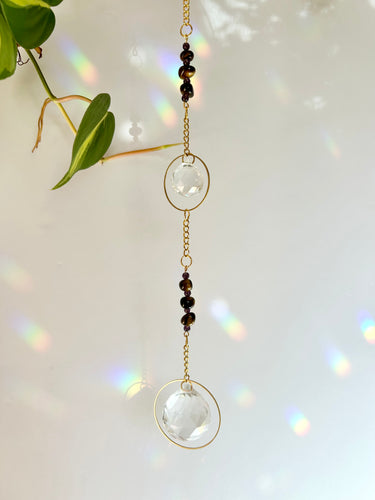 Double Prism Suncatcher with Tiger's Eye & Amethyst Beads in Gold Frames – Rainbow Light Window Decor