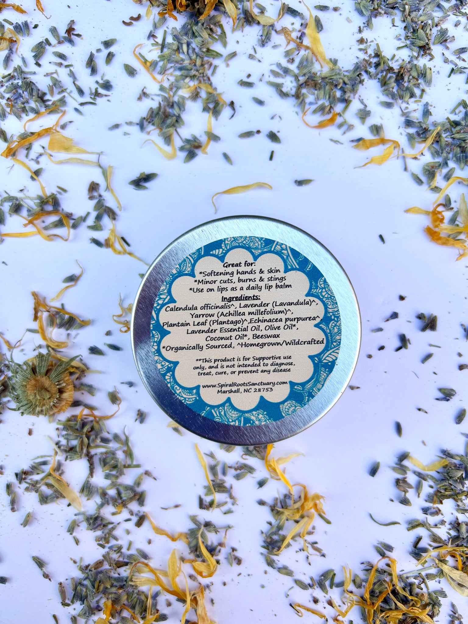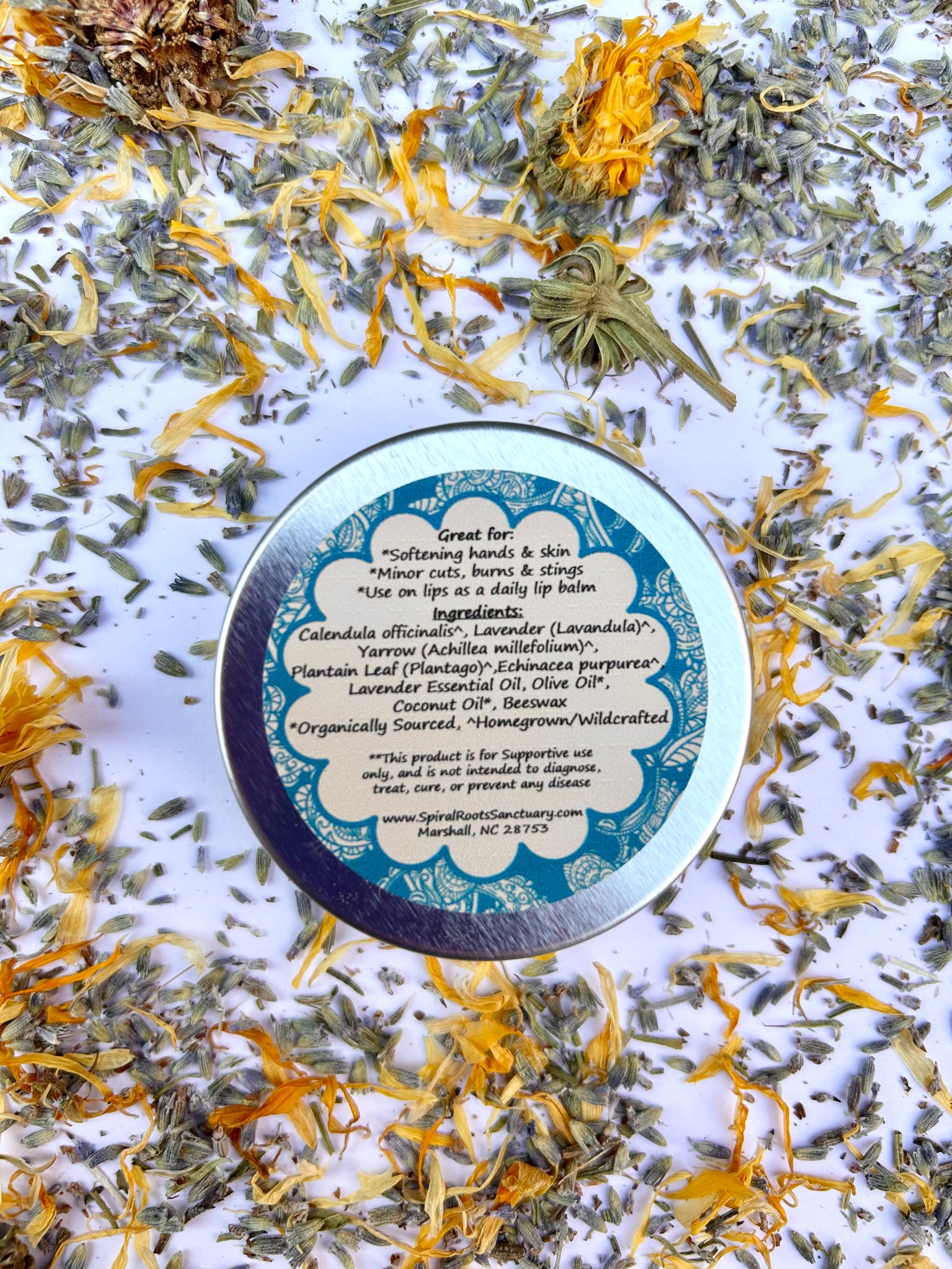 Formulated with organic Calendula, Lavender, and wildcrafted herbs, this salve helps to hydrate and refresh the skin, leaving it soft and smooth. Whether you need to soften rough hands, protect your lips, or simply nourish your skin, our salve is here to support you with nature's finest ingredients.