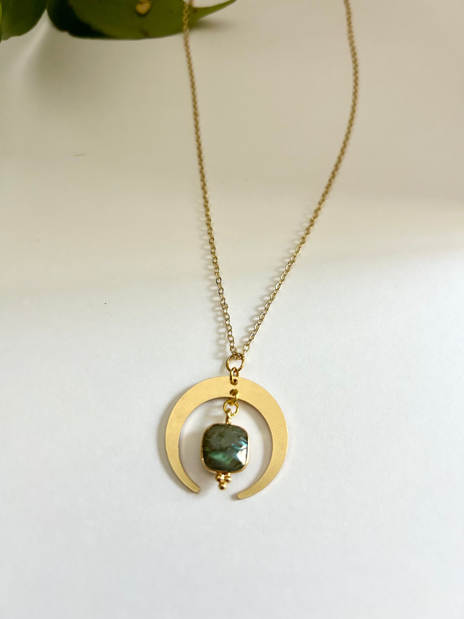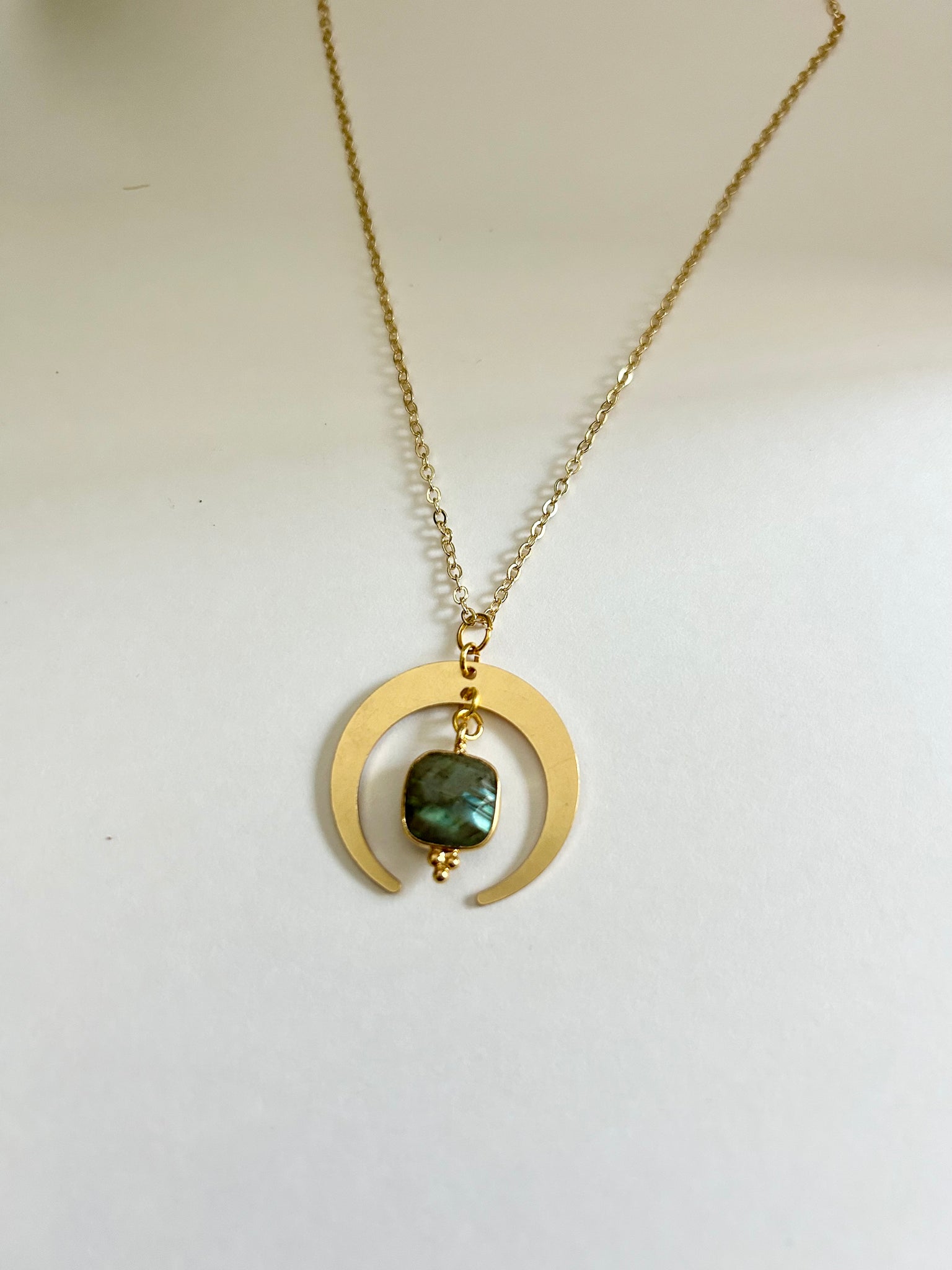 This gold half moon labradorite necklace was designed as a wearable talisman for intuition, protection, and inner transformation. A luminous labradorite charm pairs with a crescent moon pendant, reflecting the mystery and magic of the night sky.