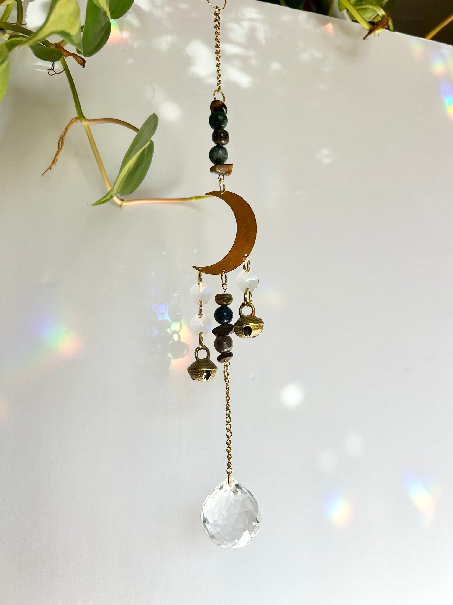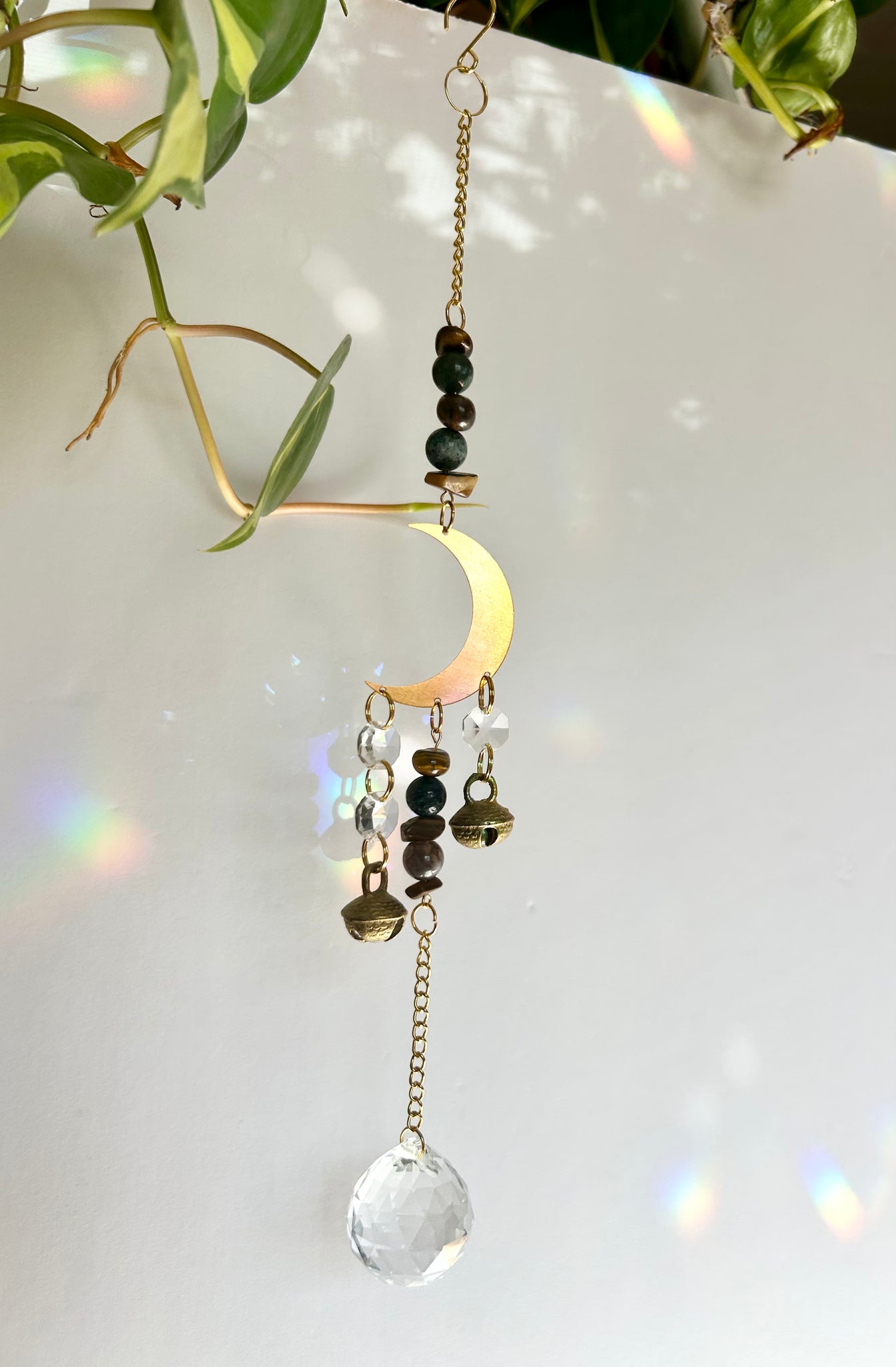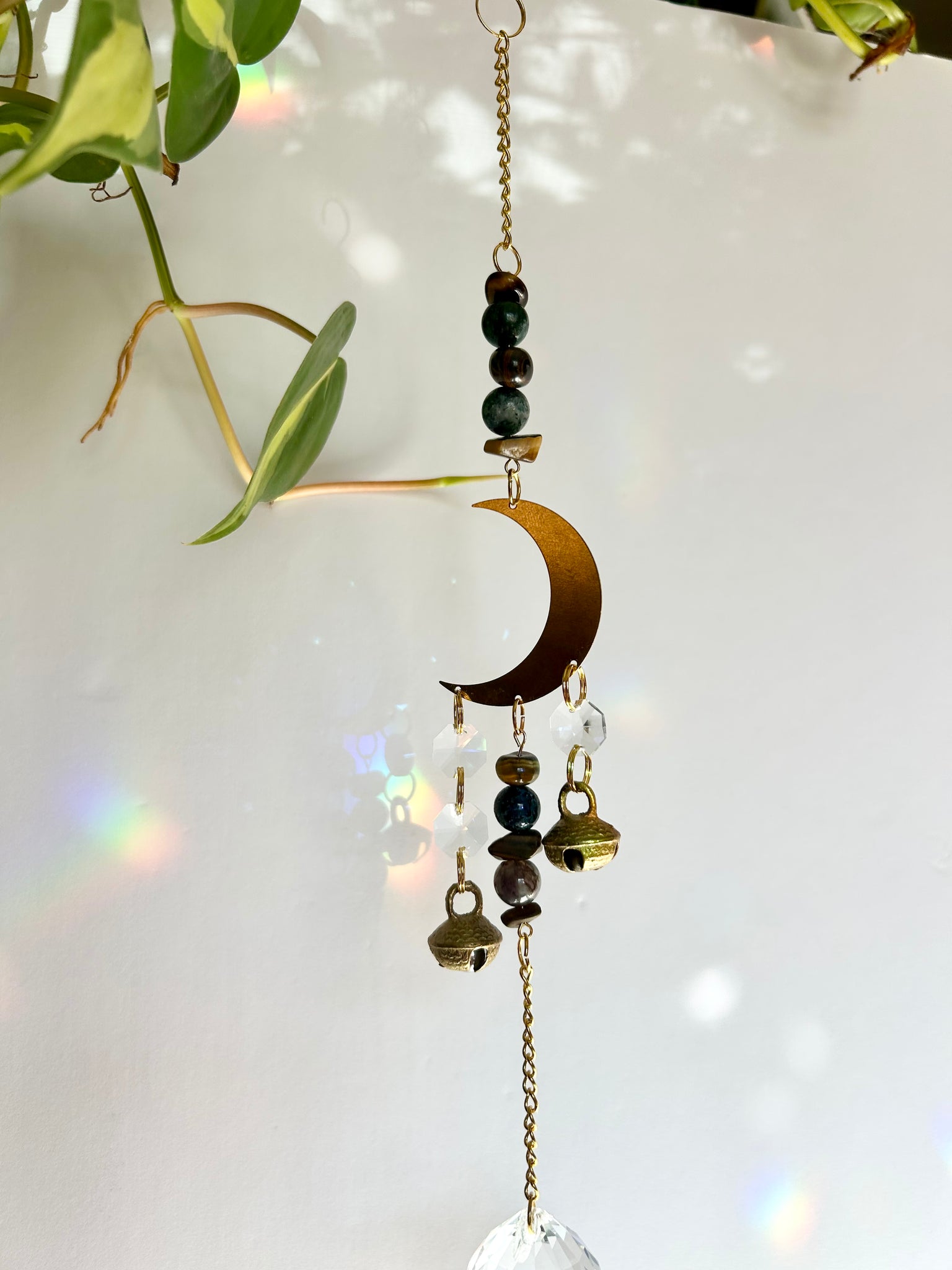 Bring light, grounding, and a touch of whimsy into your home with this Gold Half Moon Suncatcher. Featuring Agate and Tiger’s Eye beads, delicate brass bells, and a gold chain, this elegant hanging ornament catches sunlight and scatters subtle rainbow reflections across your walls, adding both beauty and gentle energy to your space.