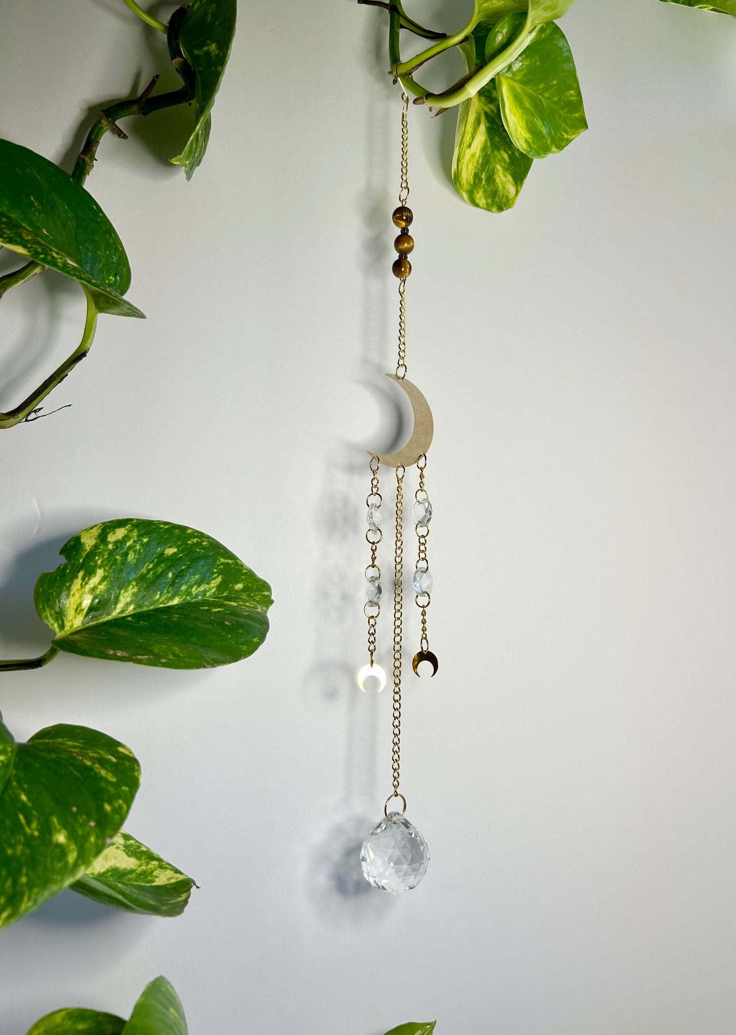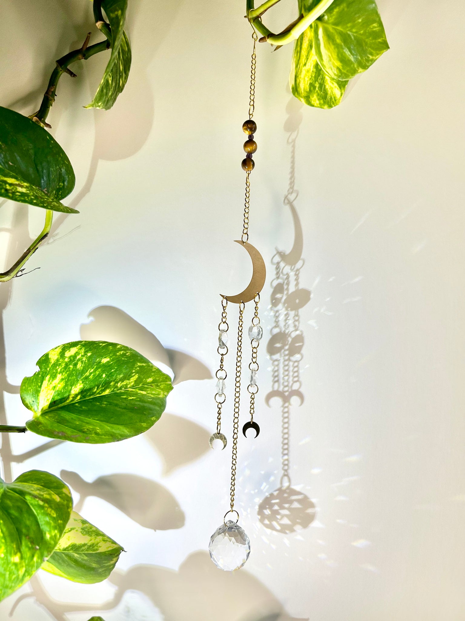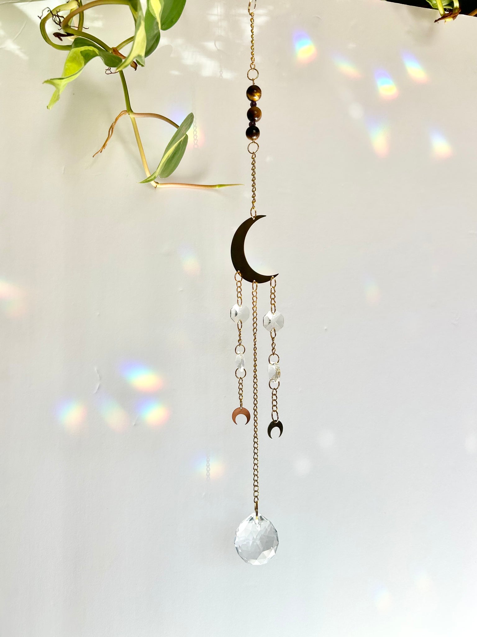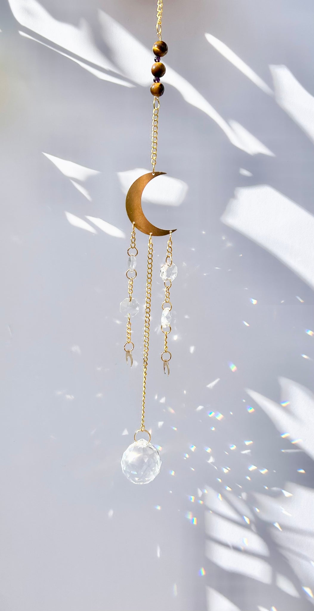 This piece features genuine Tiger’s Eye and Amethyst beads, adding rich earthy tones and natural crystal beauty to the design. The gold moon accent gives it a soft, celestial glow, making it a perfect statement piece for windows, plant shelves, meditation corners, bedrooms, or cozy living spaces.