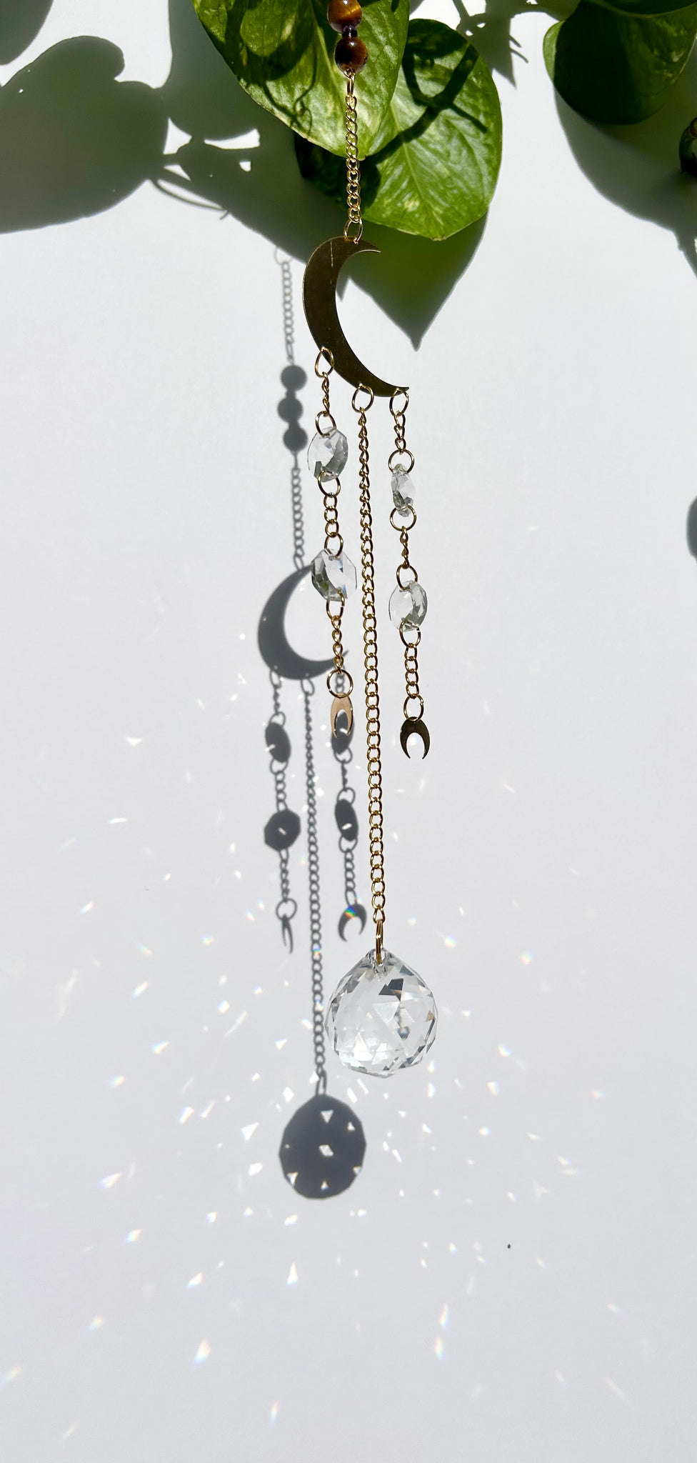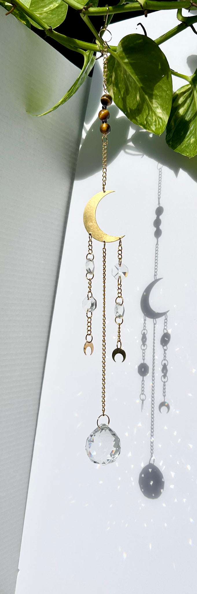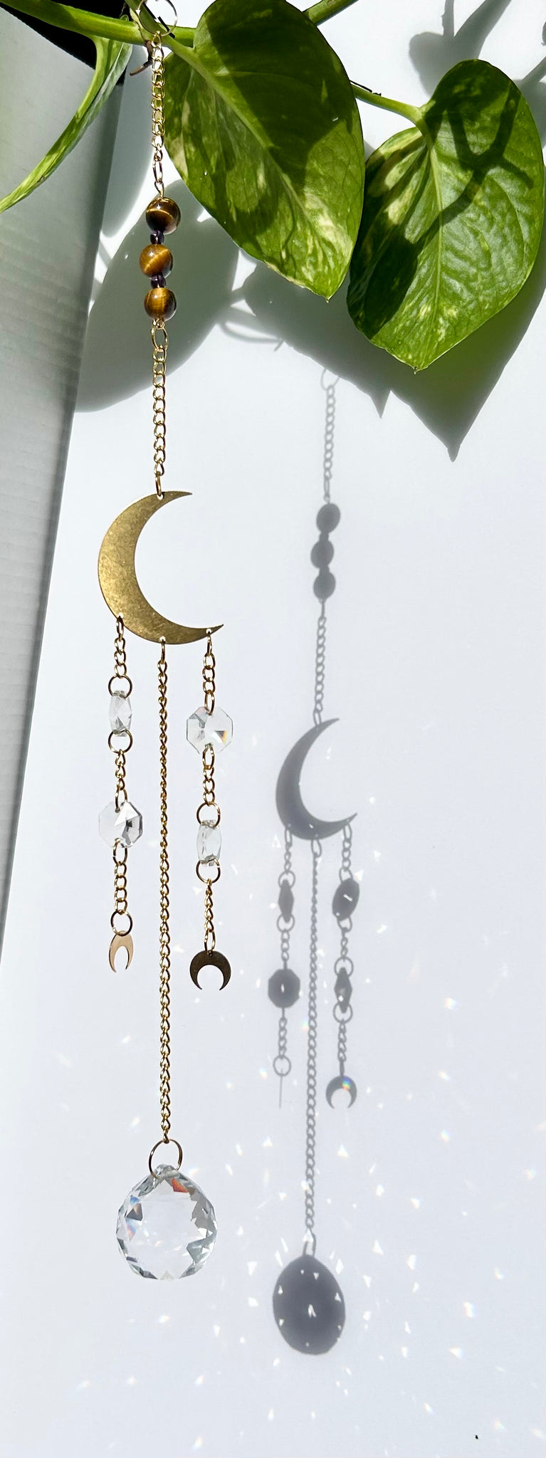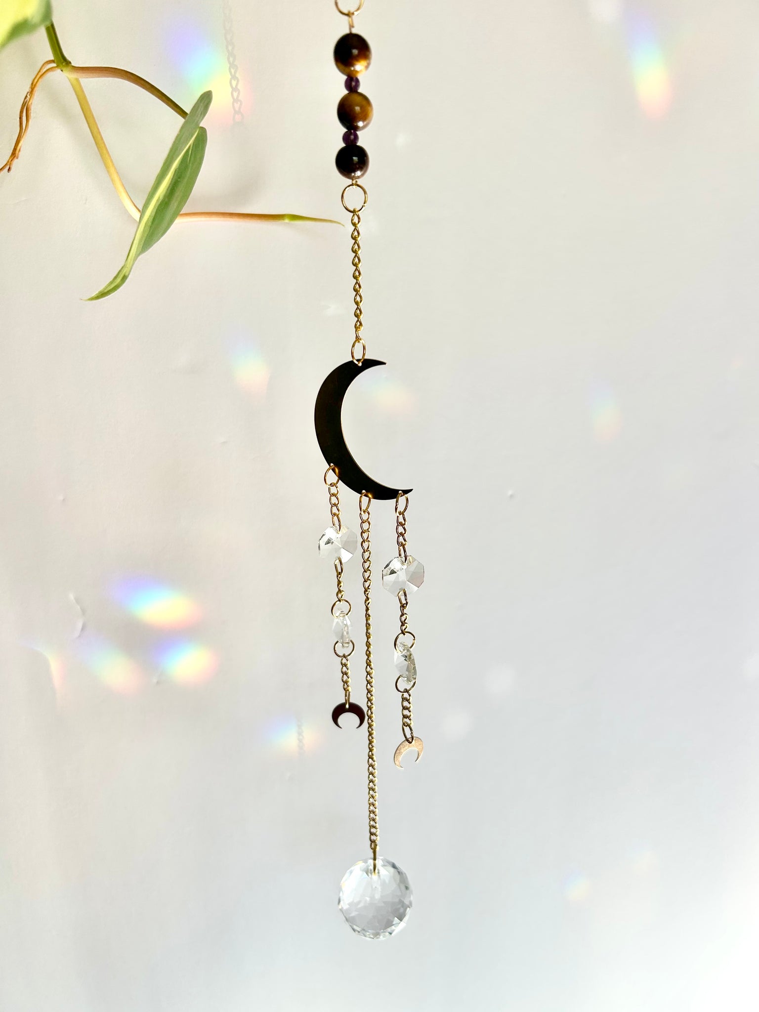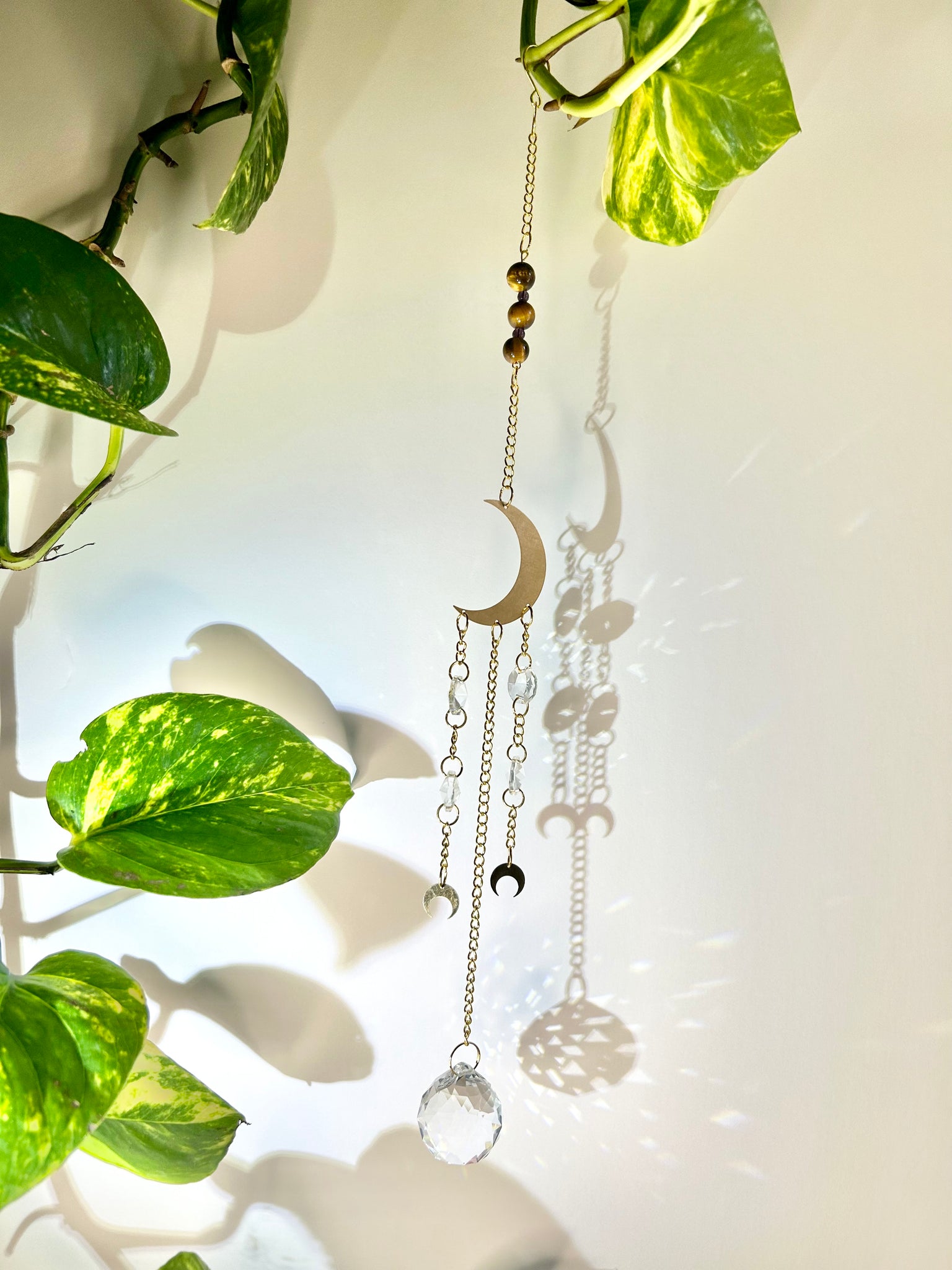 This piece features genuine Tiger’s Eye and Amethyst beads, adding rich earthy tones and natural crystal beauty to the design. The gold moon accent gives it a soft, celestial glow, making it a perfect statement piece for windows, plant shelves, meditation corners, bedrooms, or cozy living spaces.