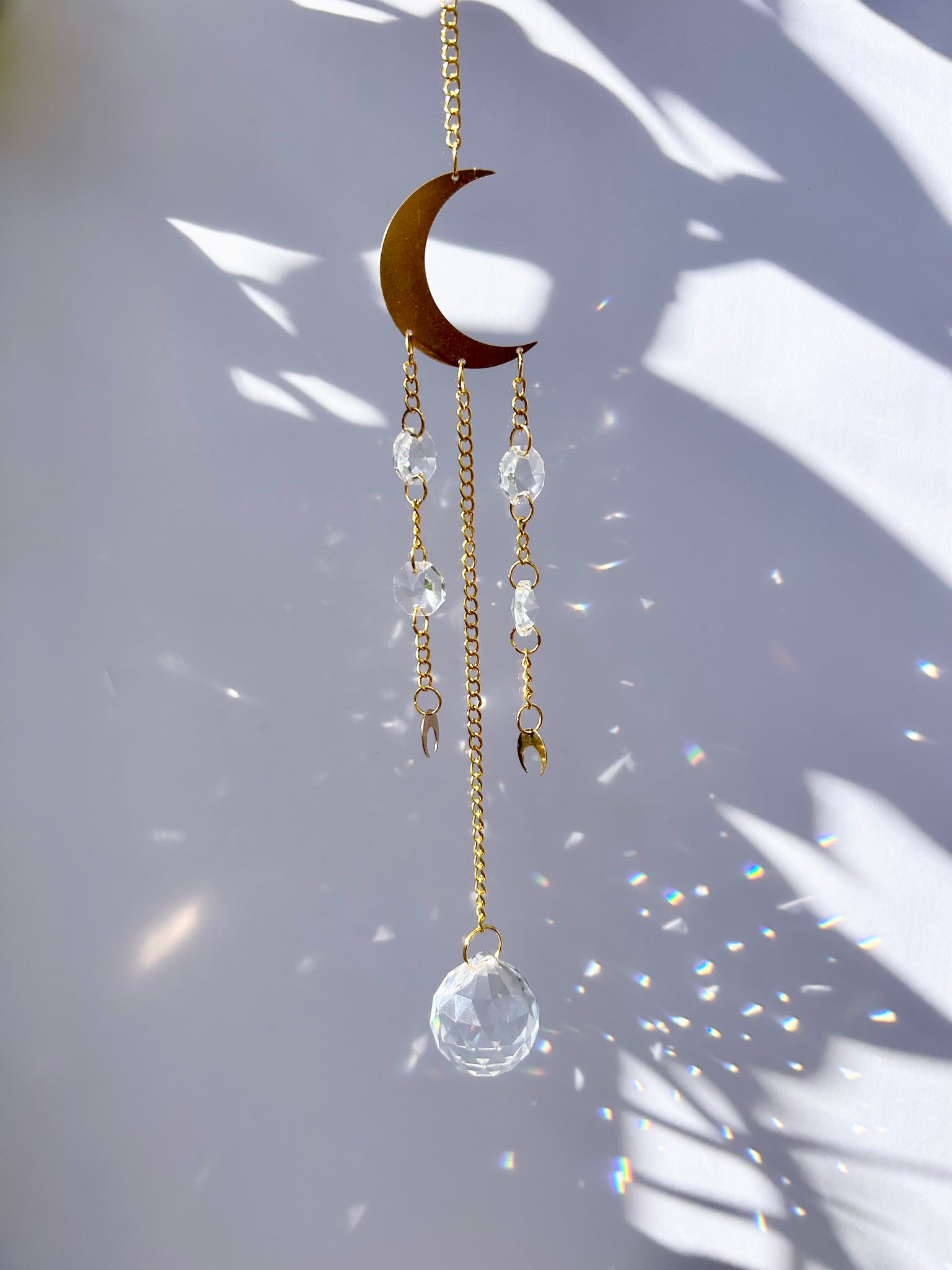 Bring a touch of celestial magic into your home with this handcrafted Gold Moon Sun Catcher, designed to fill your space with shimmering light and vibrant rainbow reflections. A high-quality prism catches the sunlight beautifully, scattering color across your walls, floor, and ceiling.