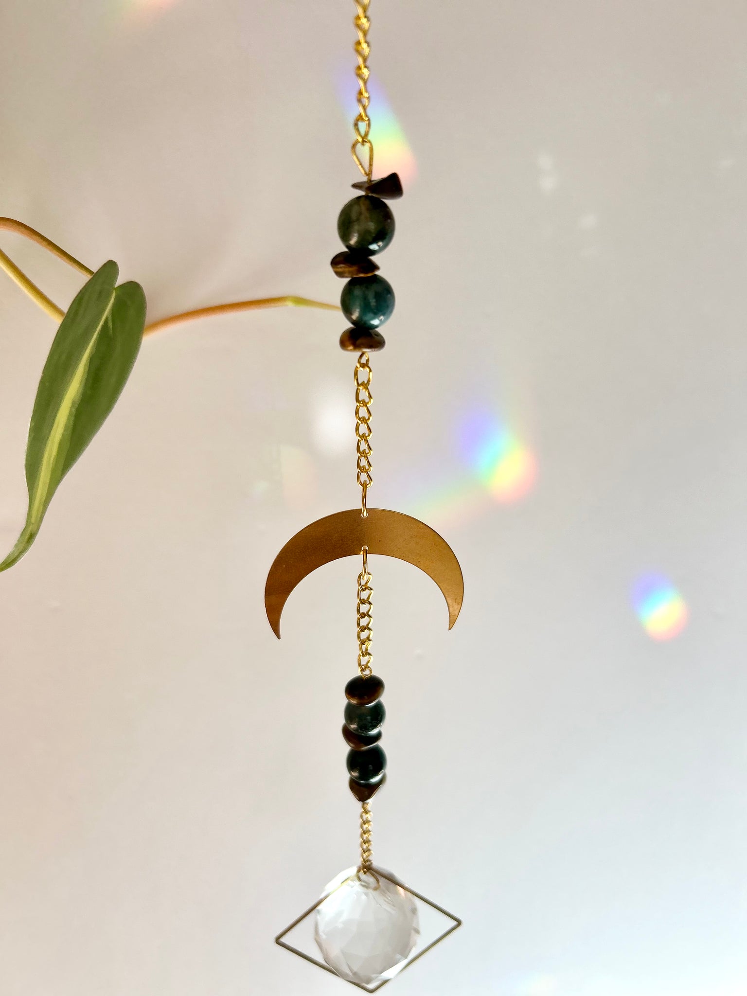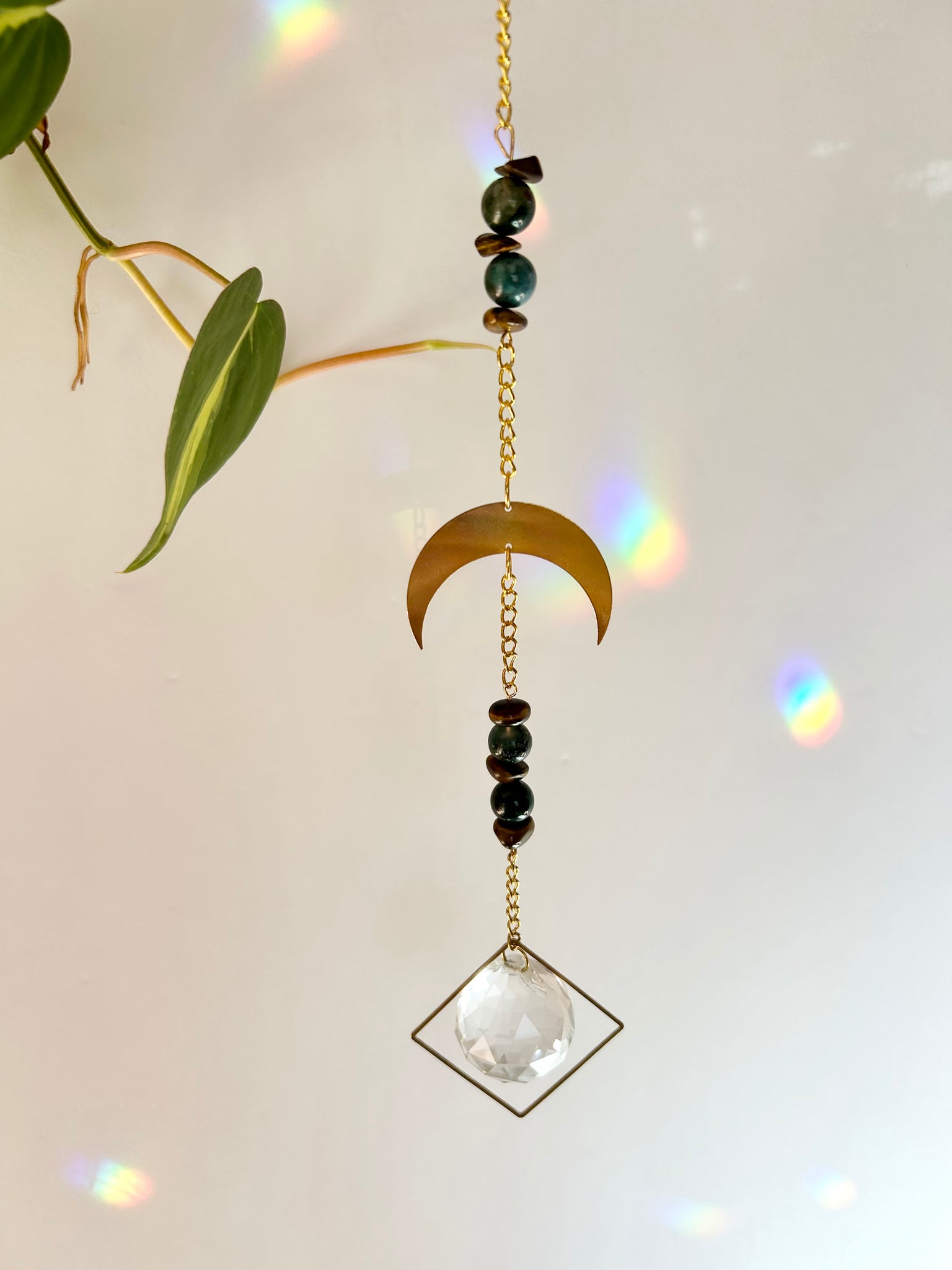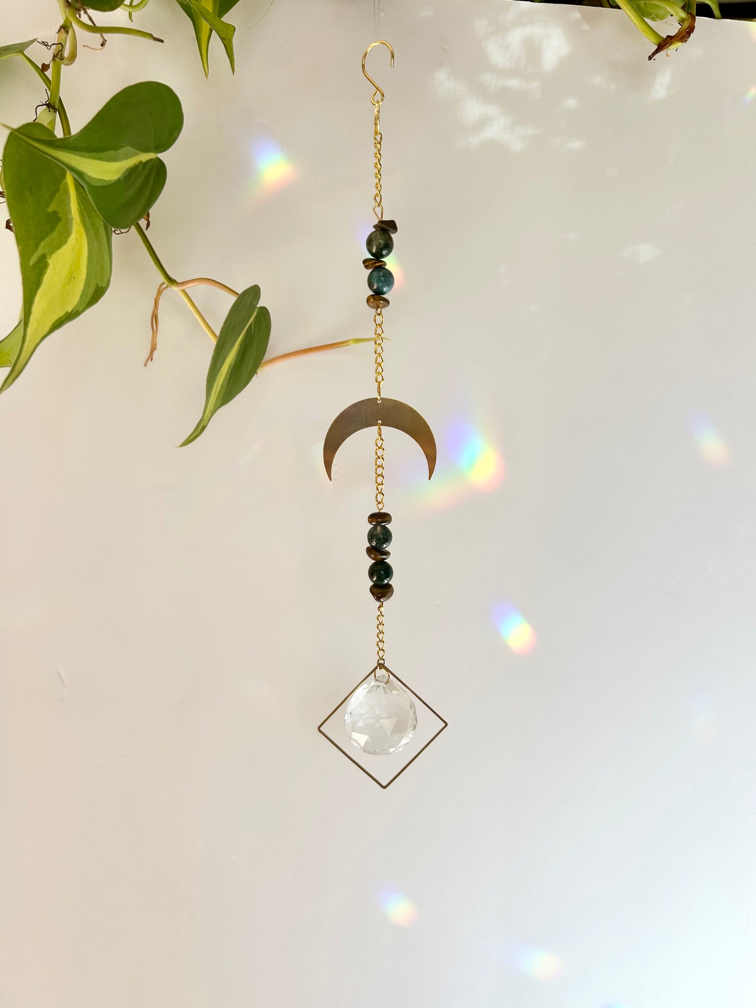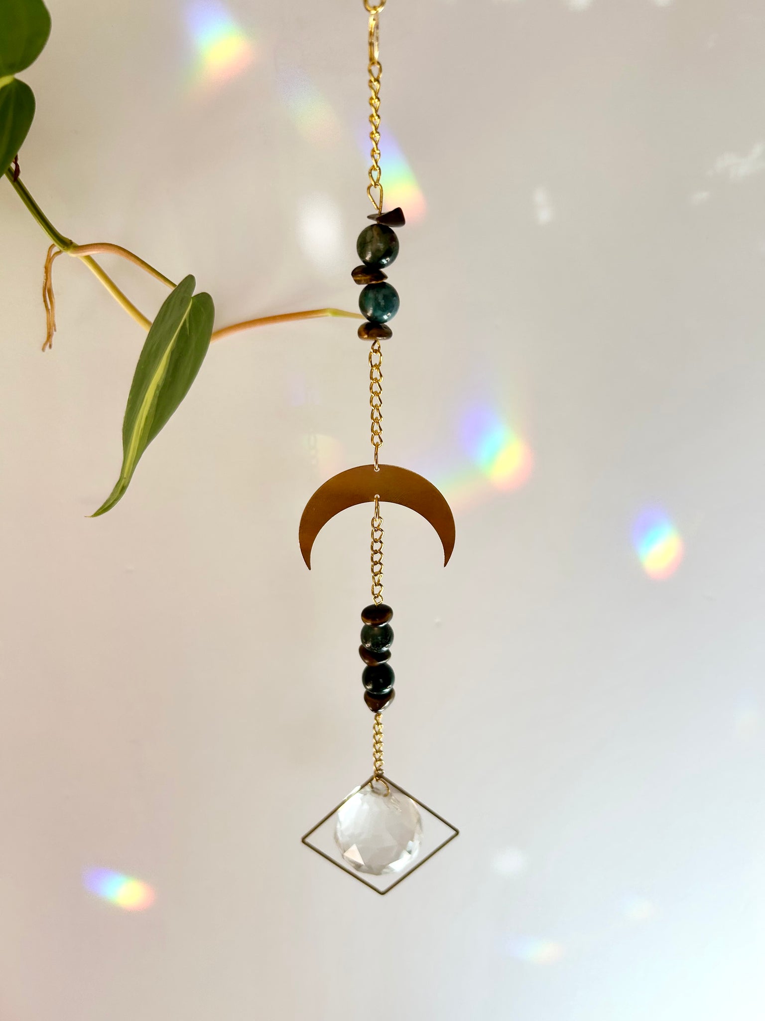 Capture sunlight and celestial energy with this Half Moon Charm Suncatcher. Featuring Agate and Tiger’s Eye beads and a prism framed in a gold diamond shape, this elegant ornament scatters vibrant rainbow reflections, bringing both light and grounding energy to your space.