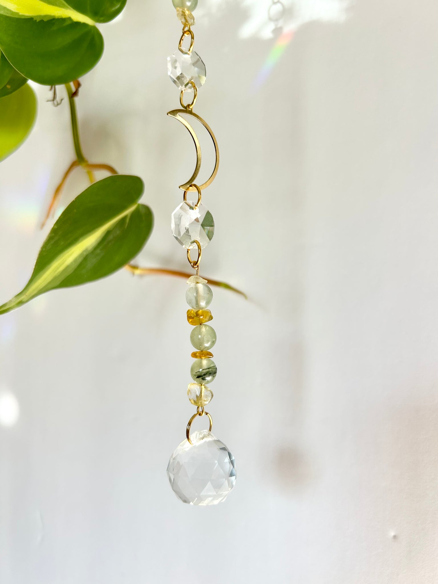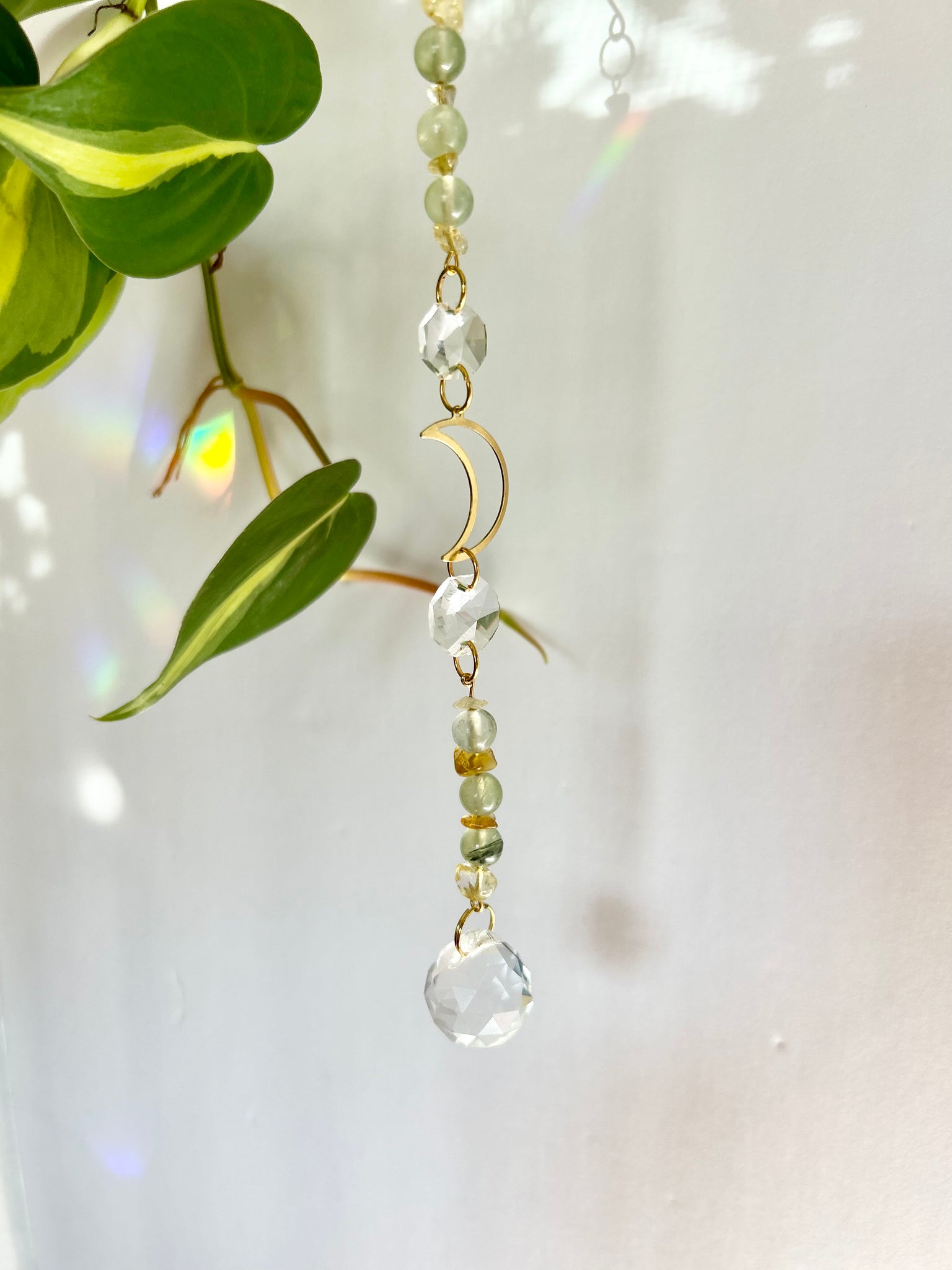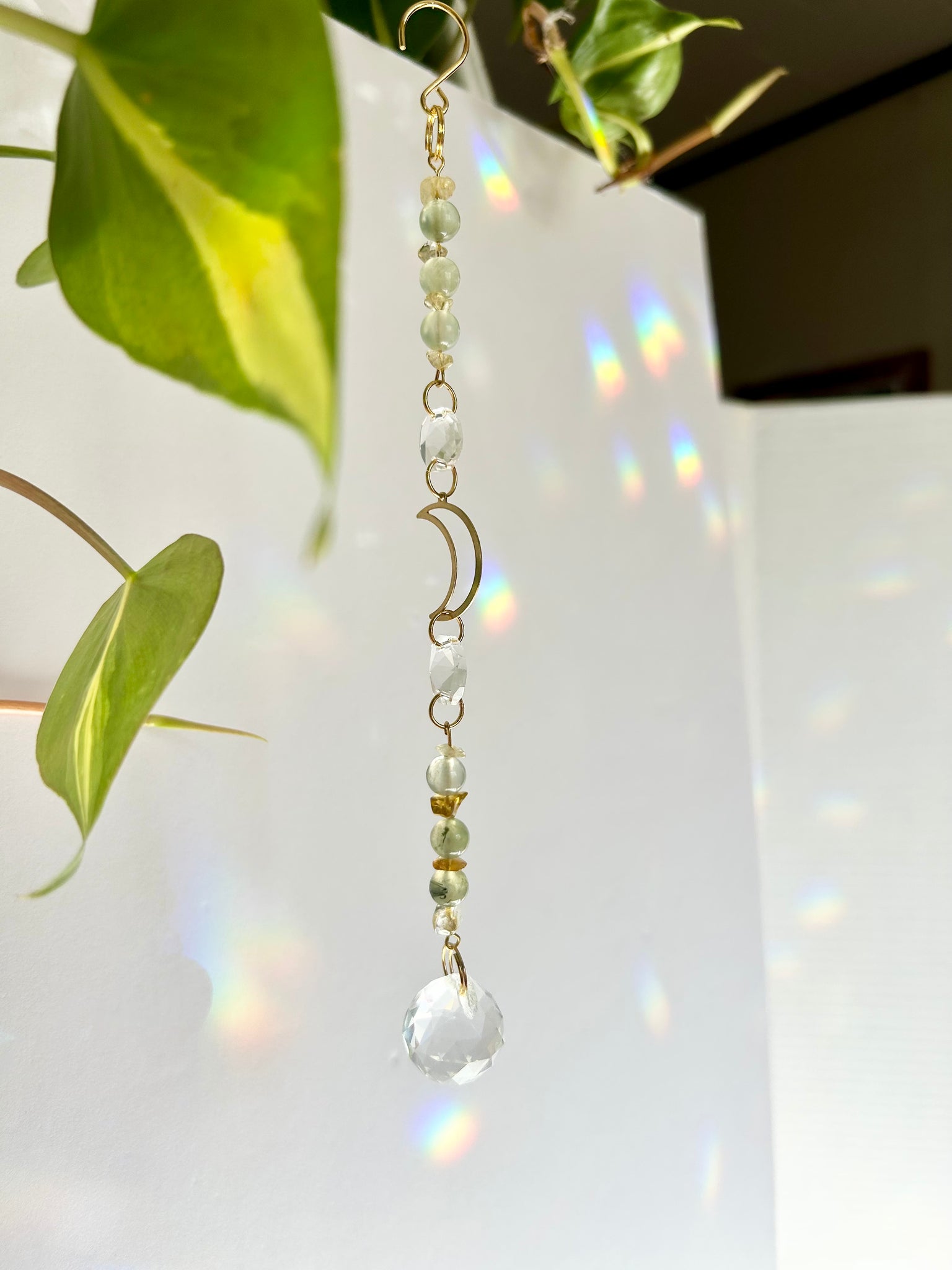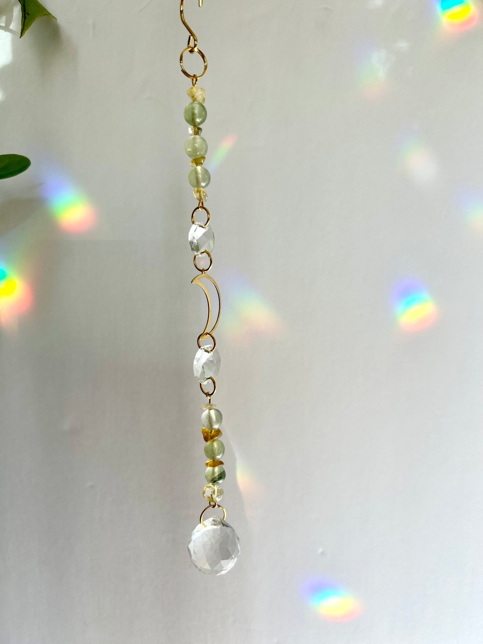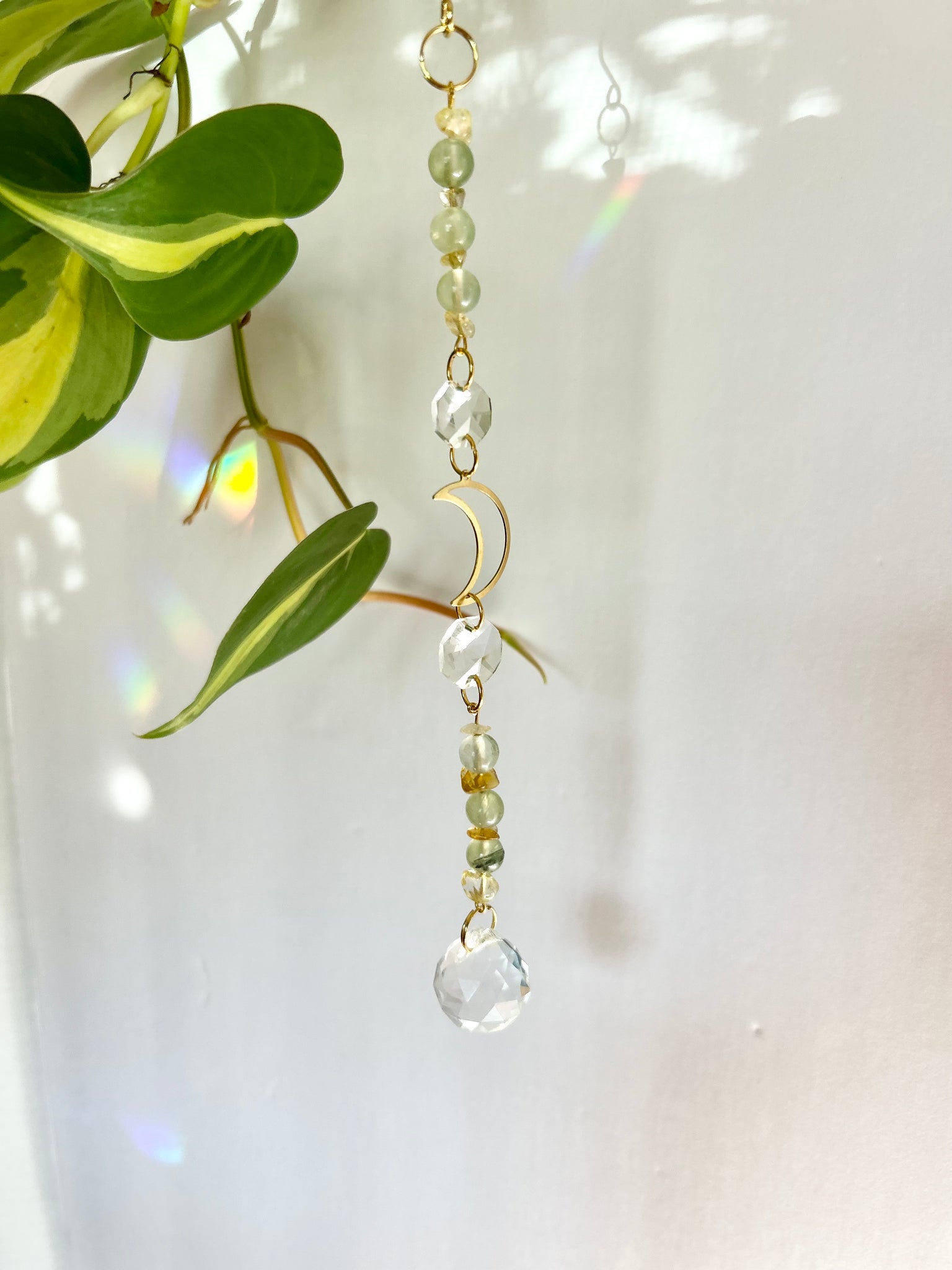 Small, sweet, and full of sparkle — this Mini Gold Moon Suncatcher is the perfect little rainbow maker for compact spaces. A clear cut crystal prism catches the sunlight and fills your room with rainbows, while the aventurine and citrine beads add a soft, uplifting color palette.