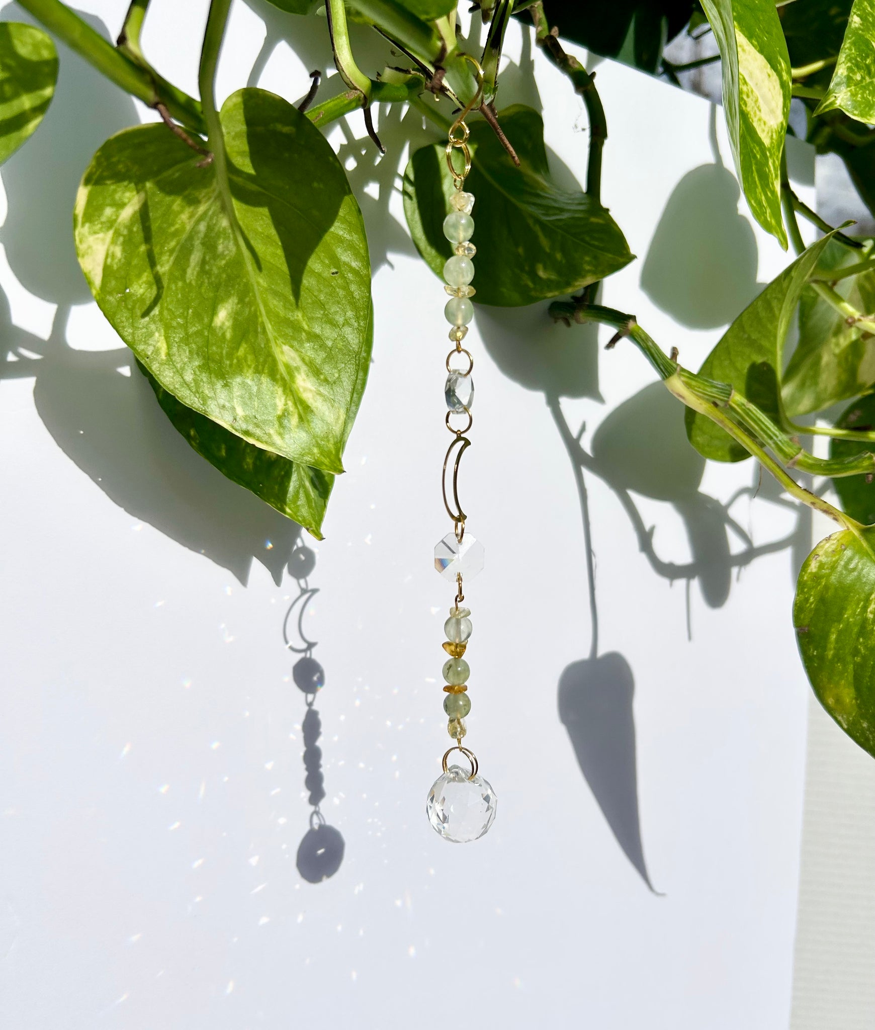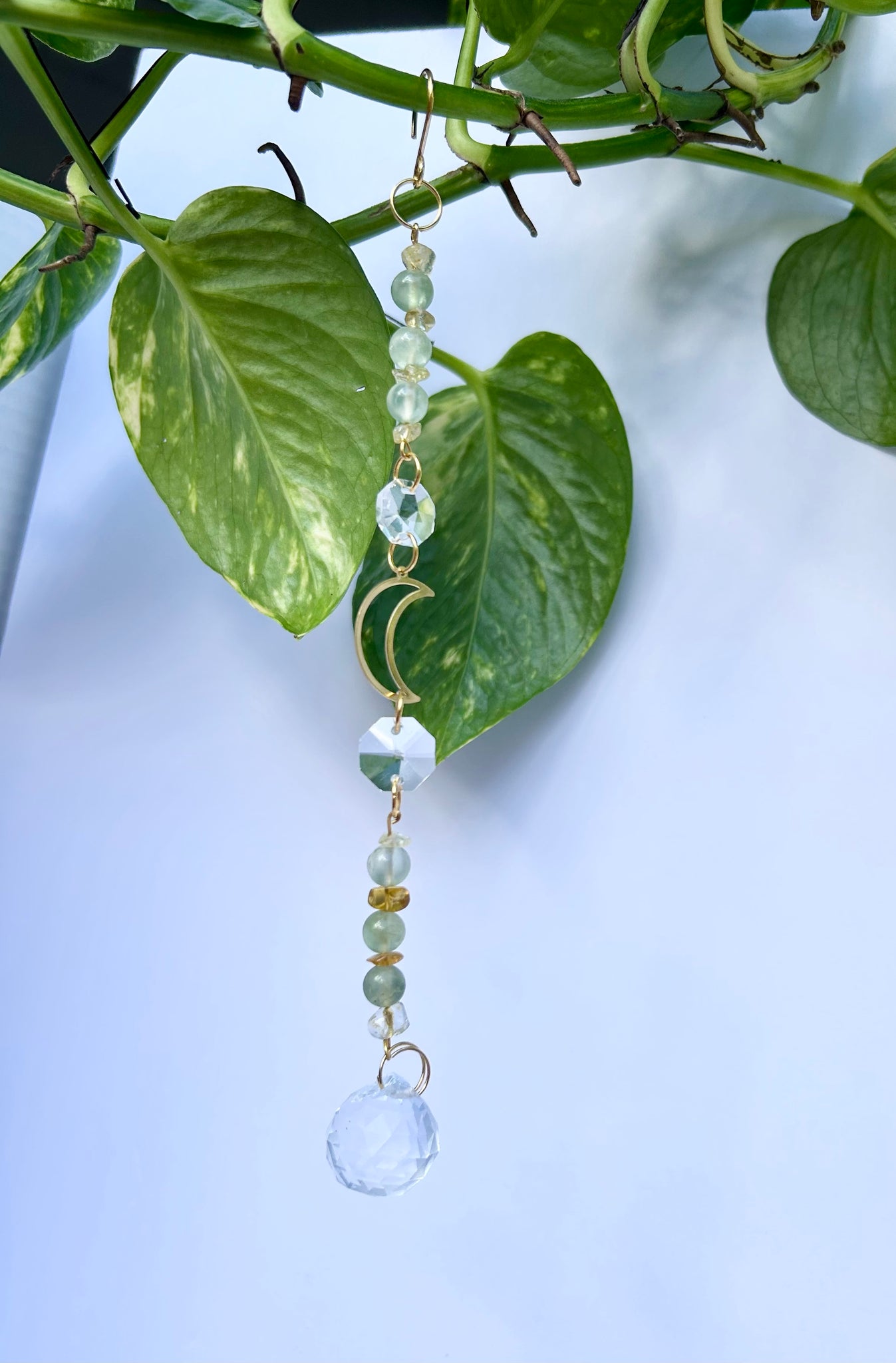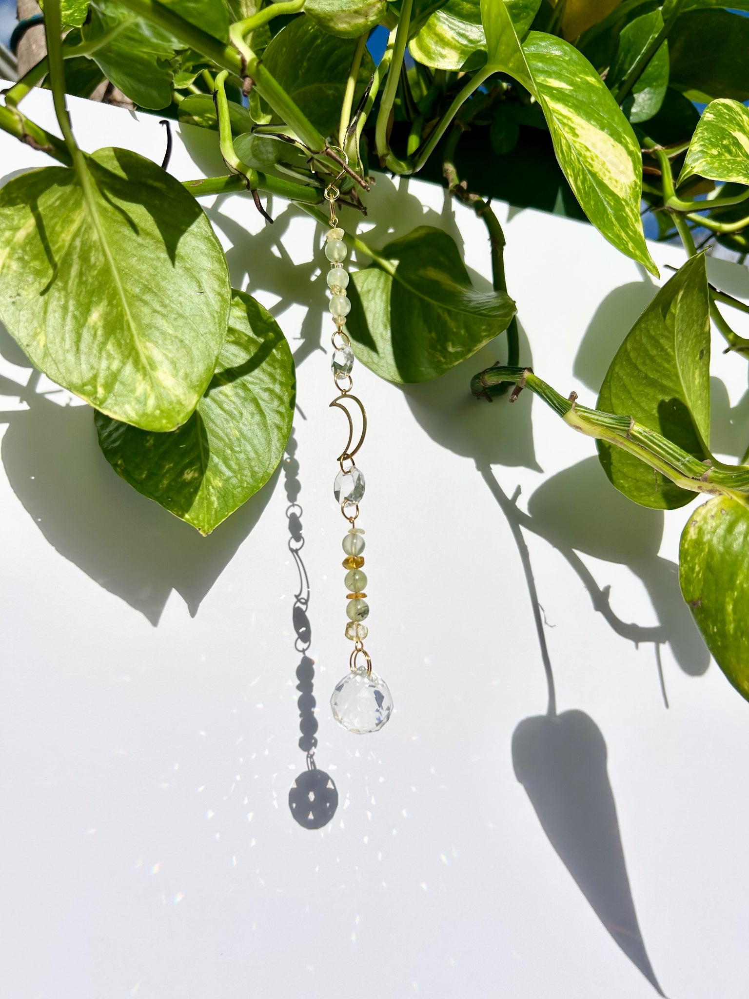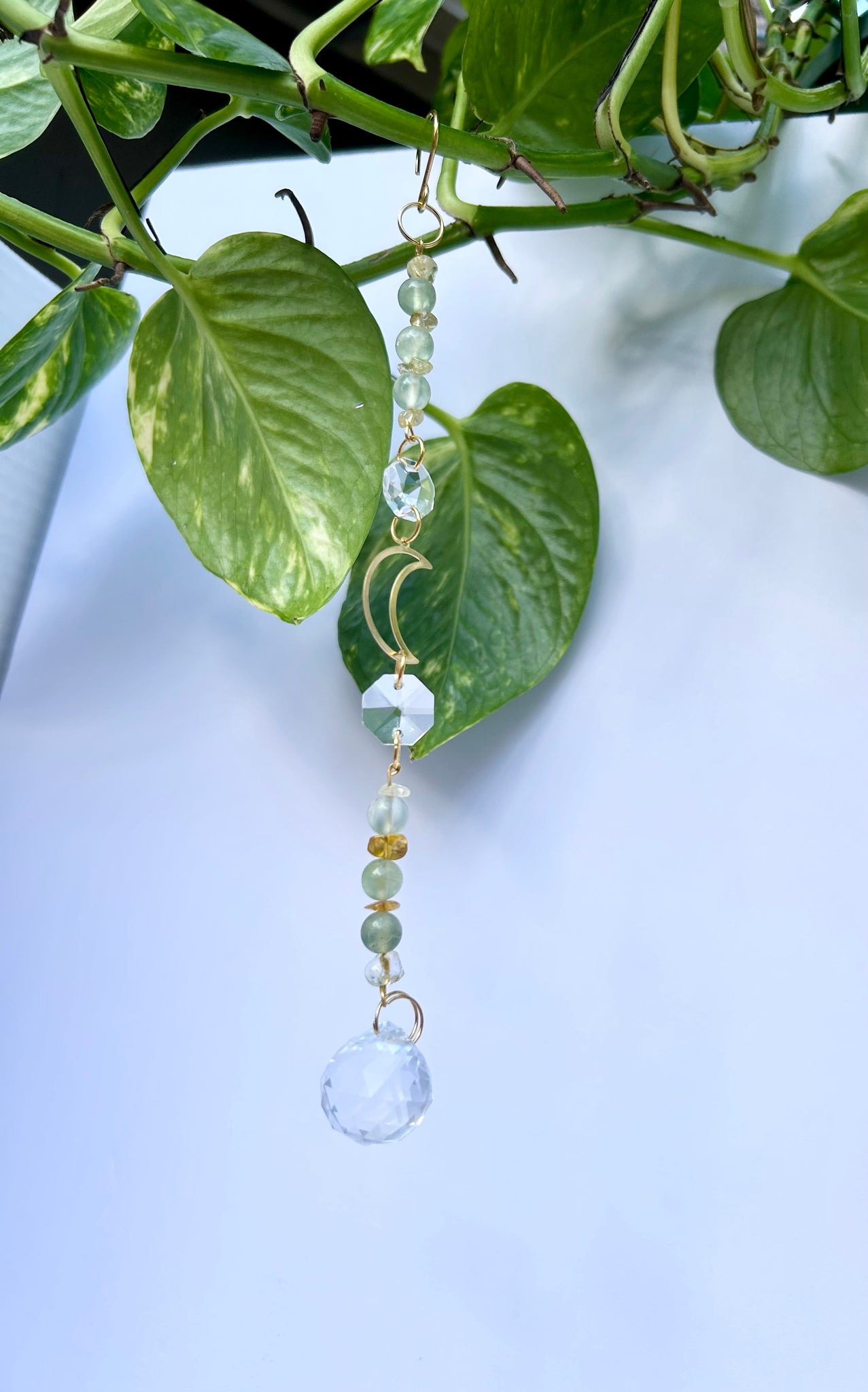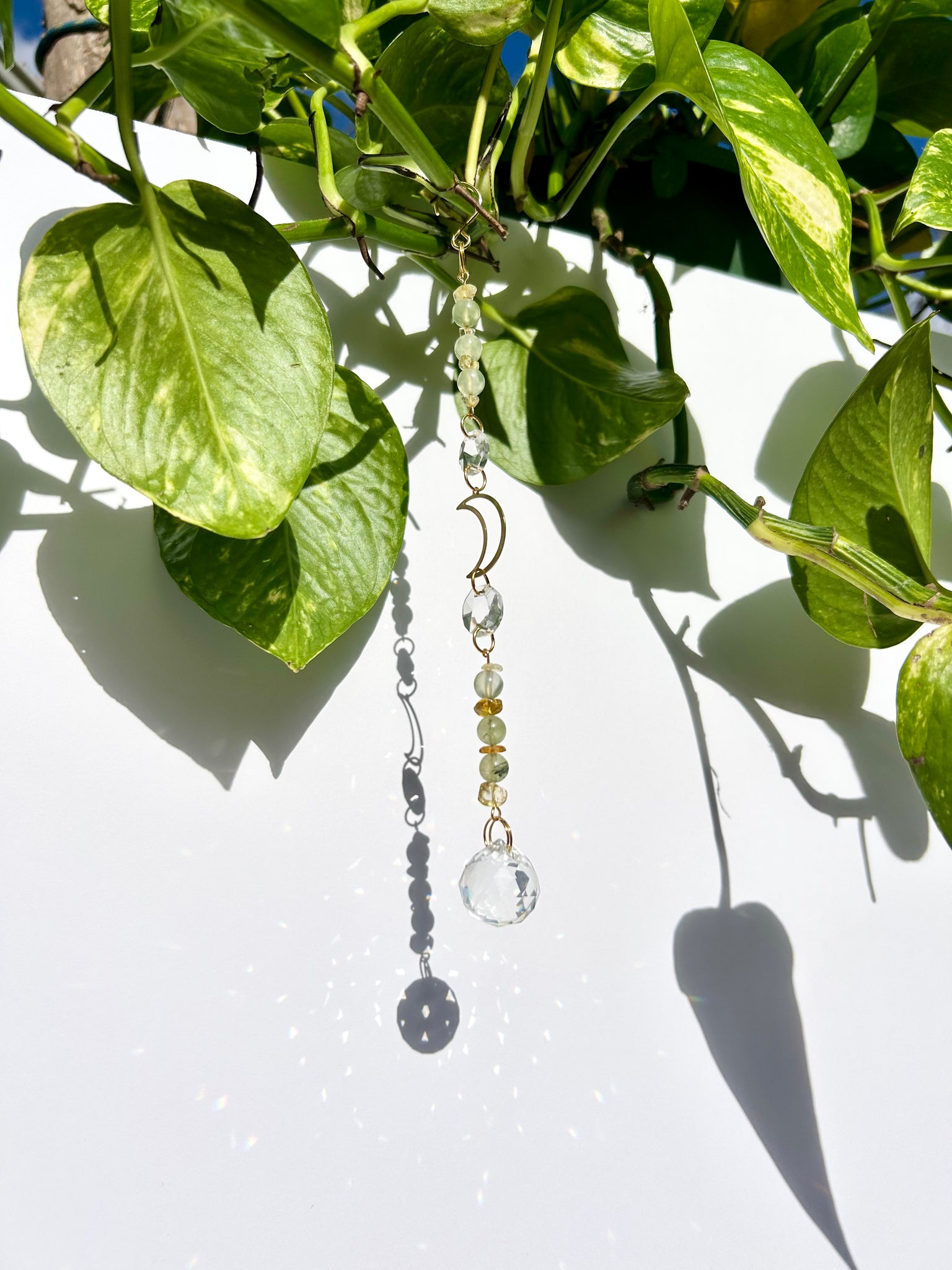 Small, sweet, and full of sparkle — this Mini Gold Moon Suncatcher is the perfect little rainbow maker for compact spaces. A clear cut crystal prism catches the sunlight and fills your room with rainbows, while the aventurine and citrine beads add a soft, uplifting color palette.