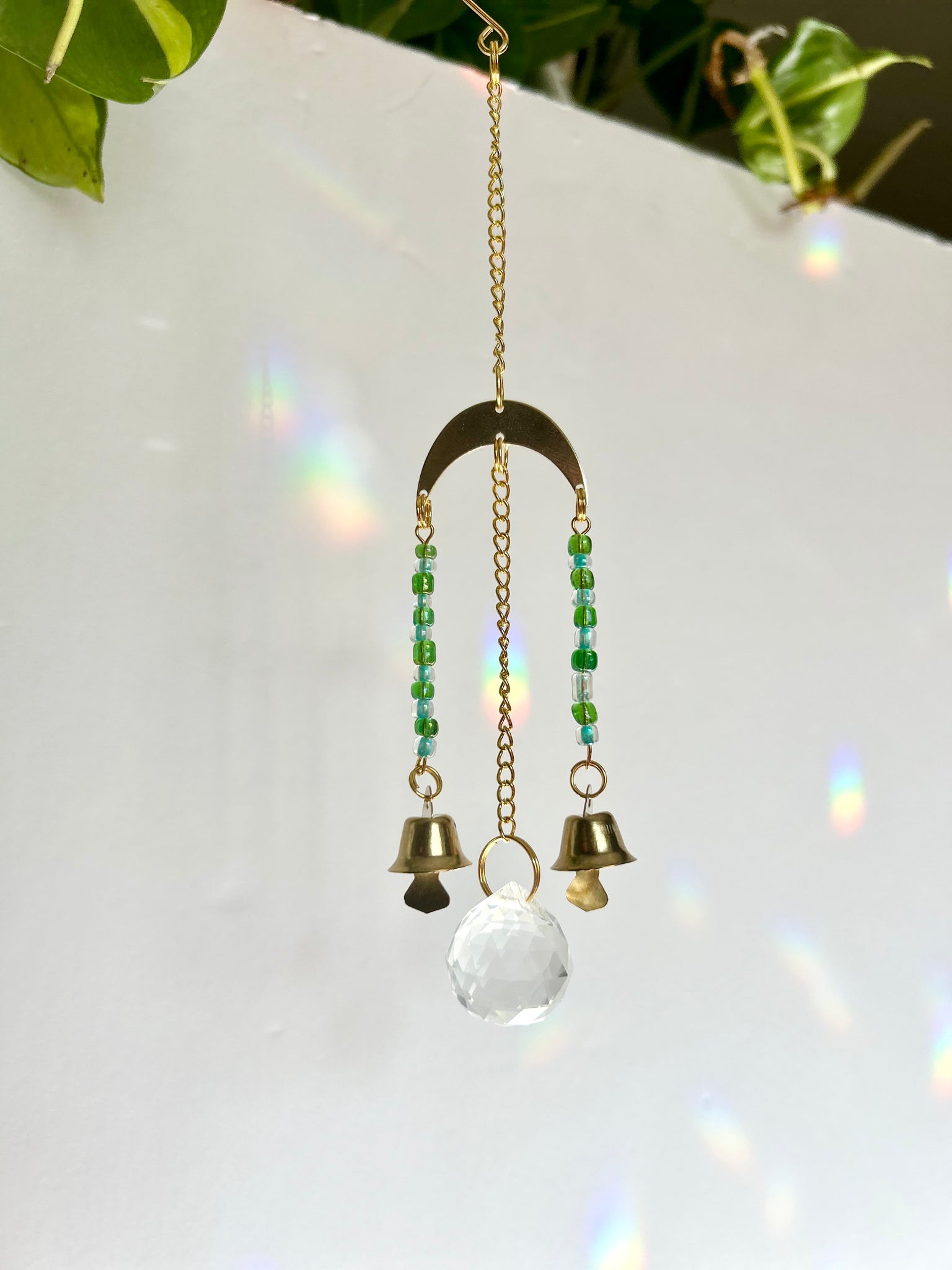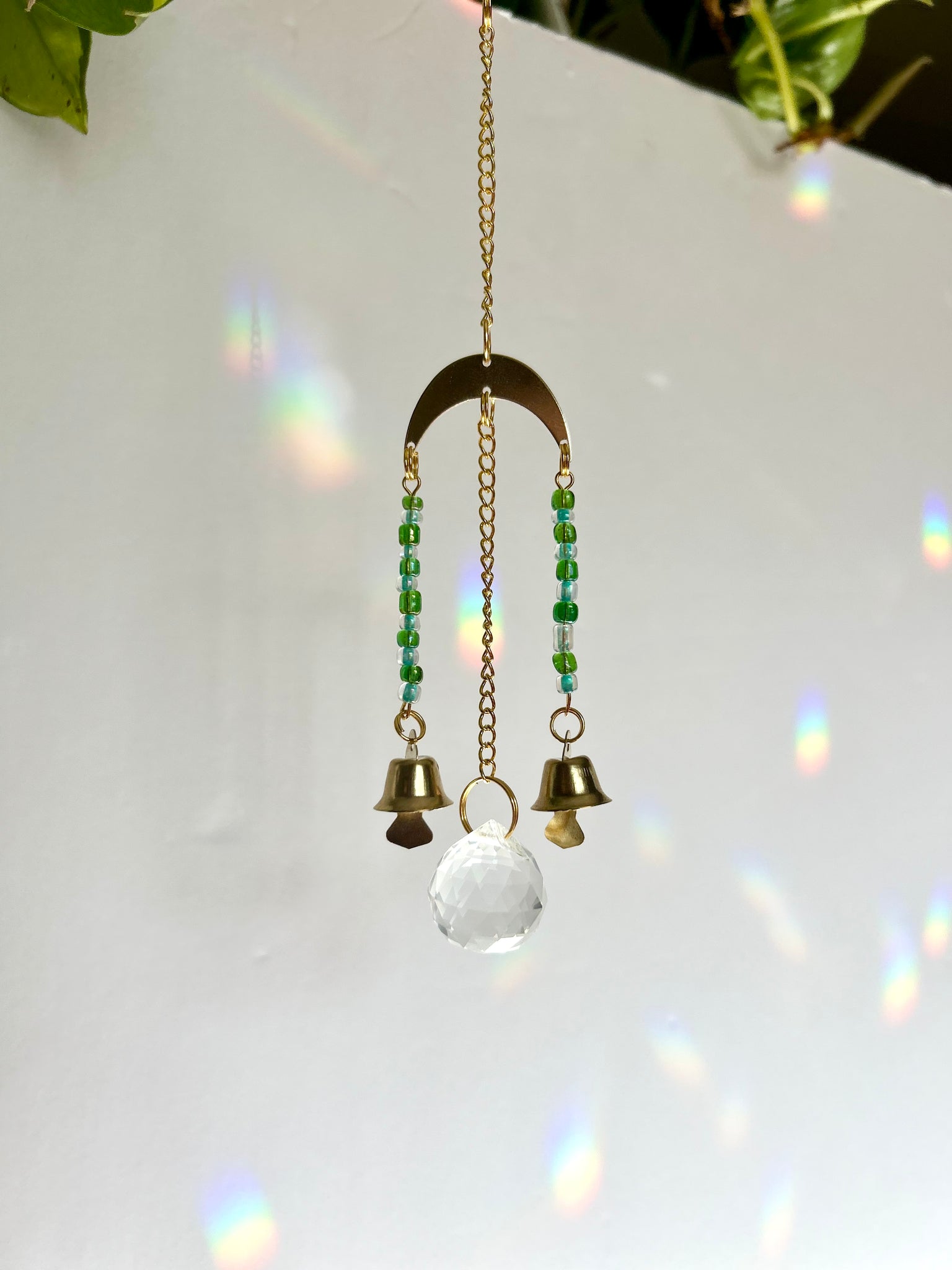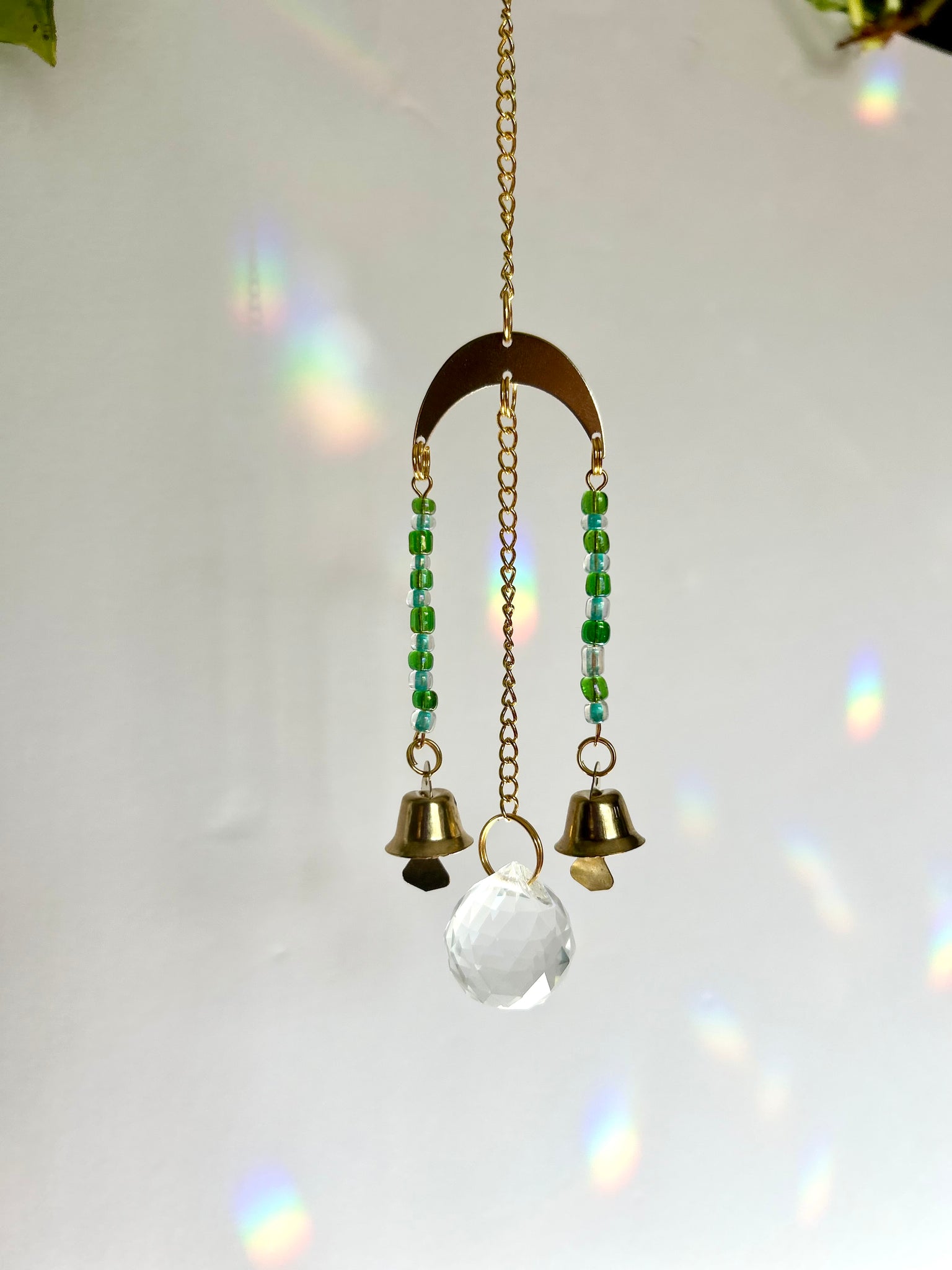 Mini Gold Moon Suncatcher with Green & Blue Glass Beads and Bells – Rainbow Prism Window Decor