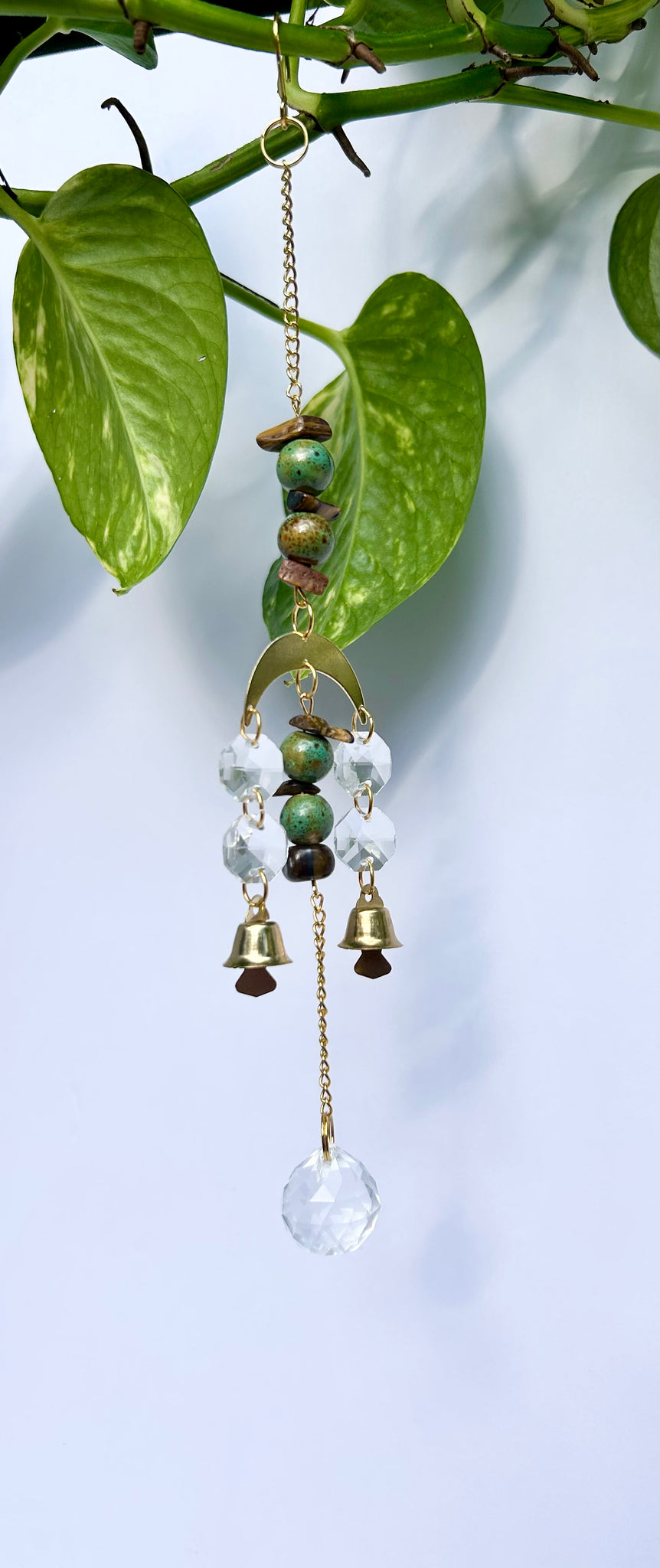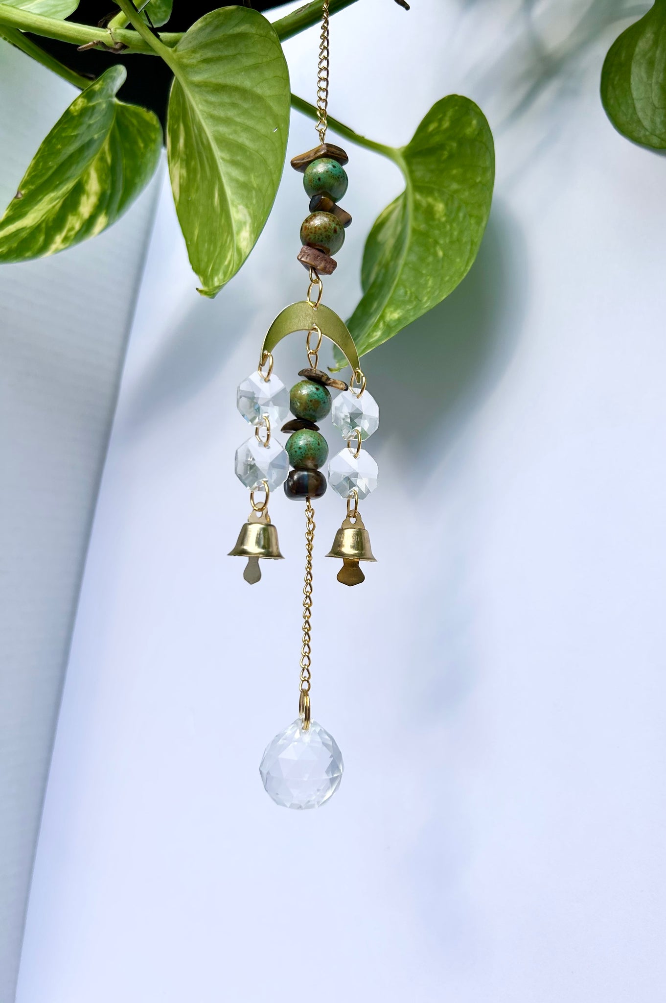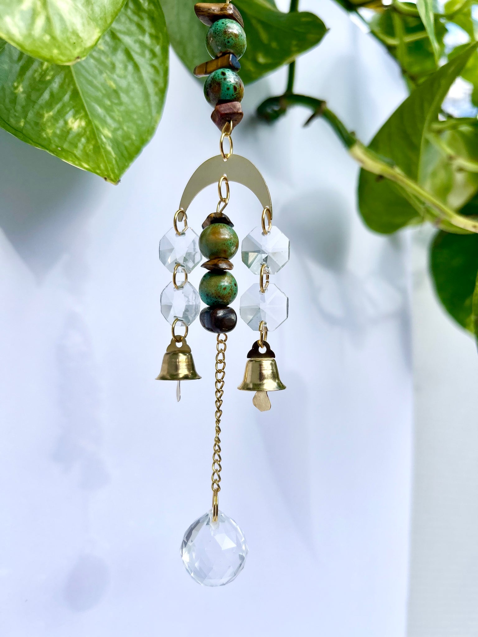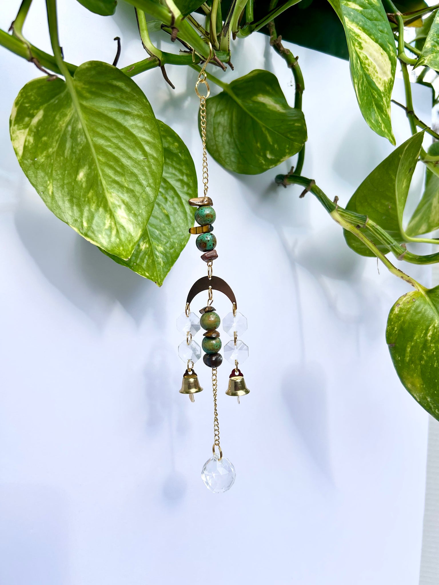 Bring a touch of magic to any space with this mini gold moon suncatcher. Handcrafted with Turquoise clay beads and Tiger’s Eye, this charming ornament hangs on a gold chain with delicate bells, adding subtle movement and sound. Perfect for boho, witchy, or crystal-inspired decor, it’s ideal for sunny windows, small spaces, or even as a thoughtful gift. Watch as sunlight catches the cut crystal and beads, scattering tiny rainbow prisms throughout your room.
