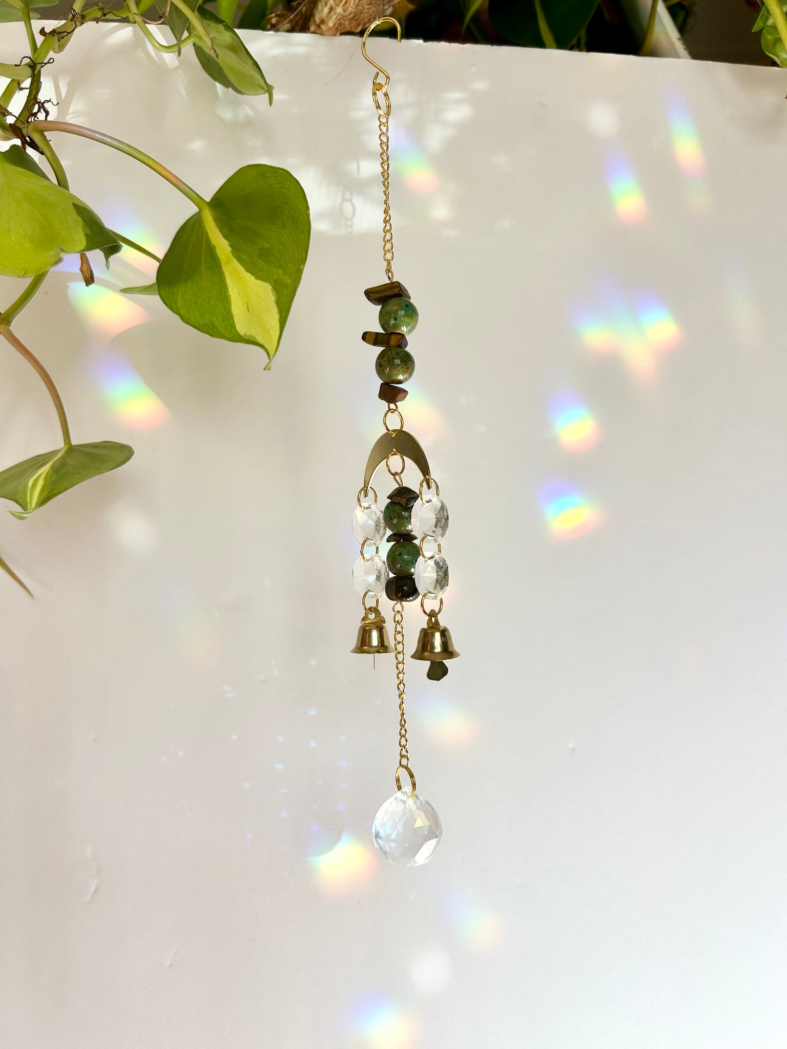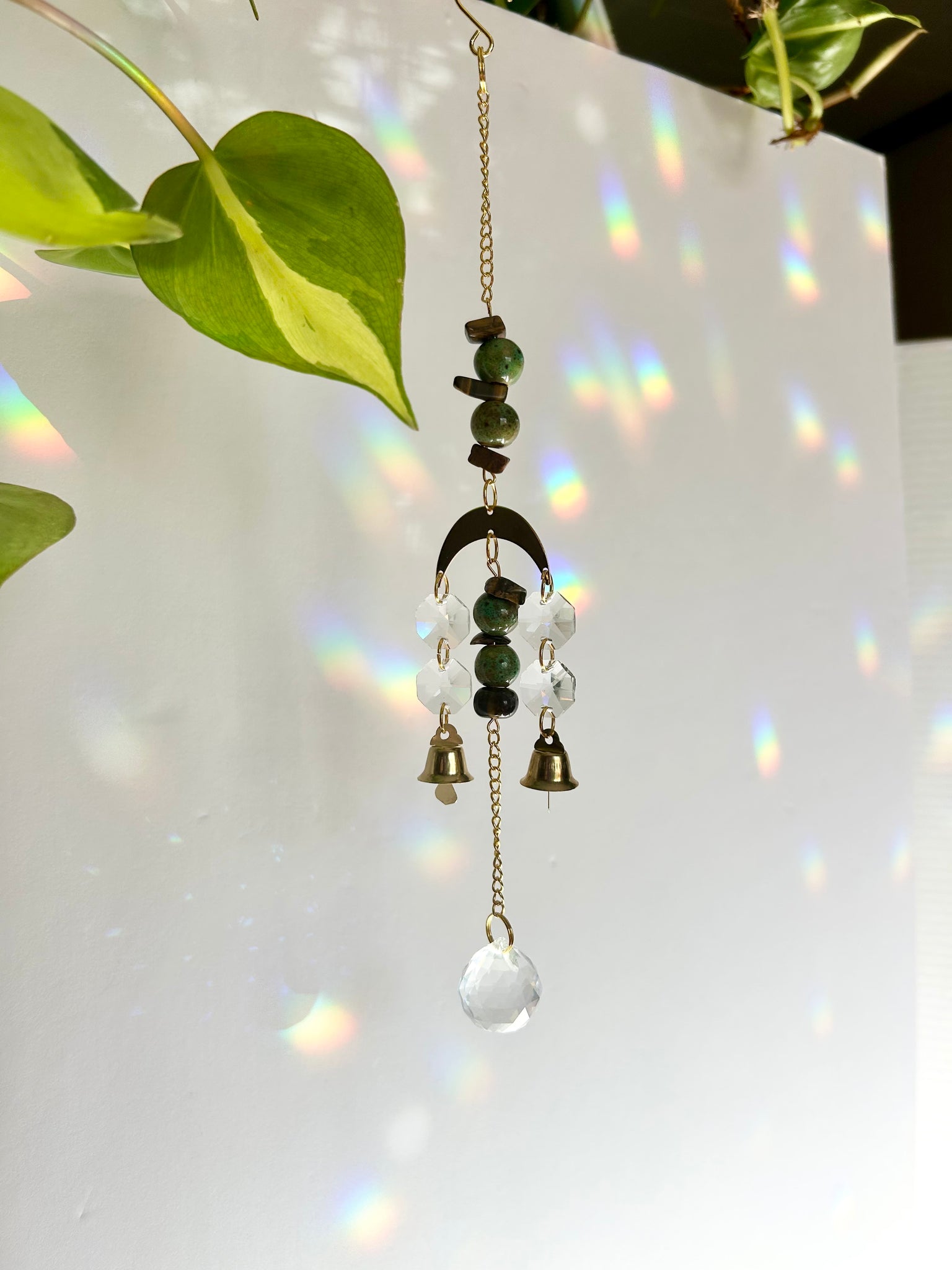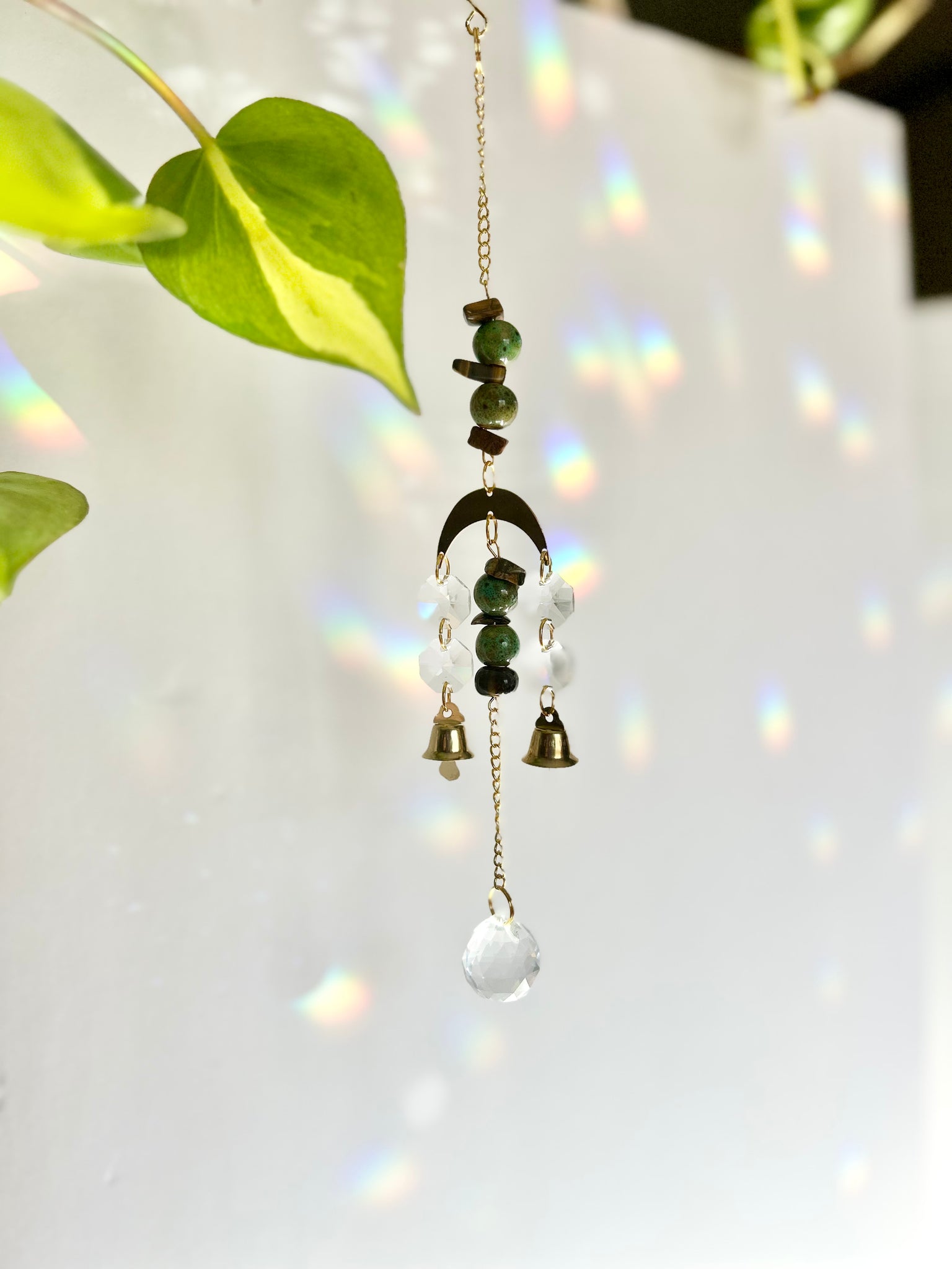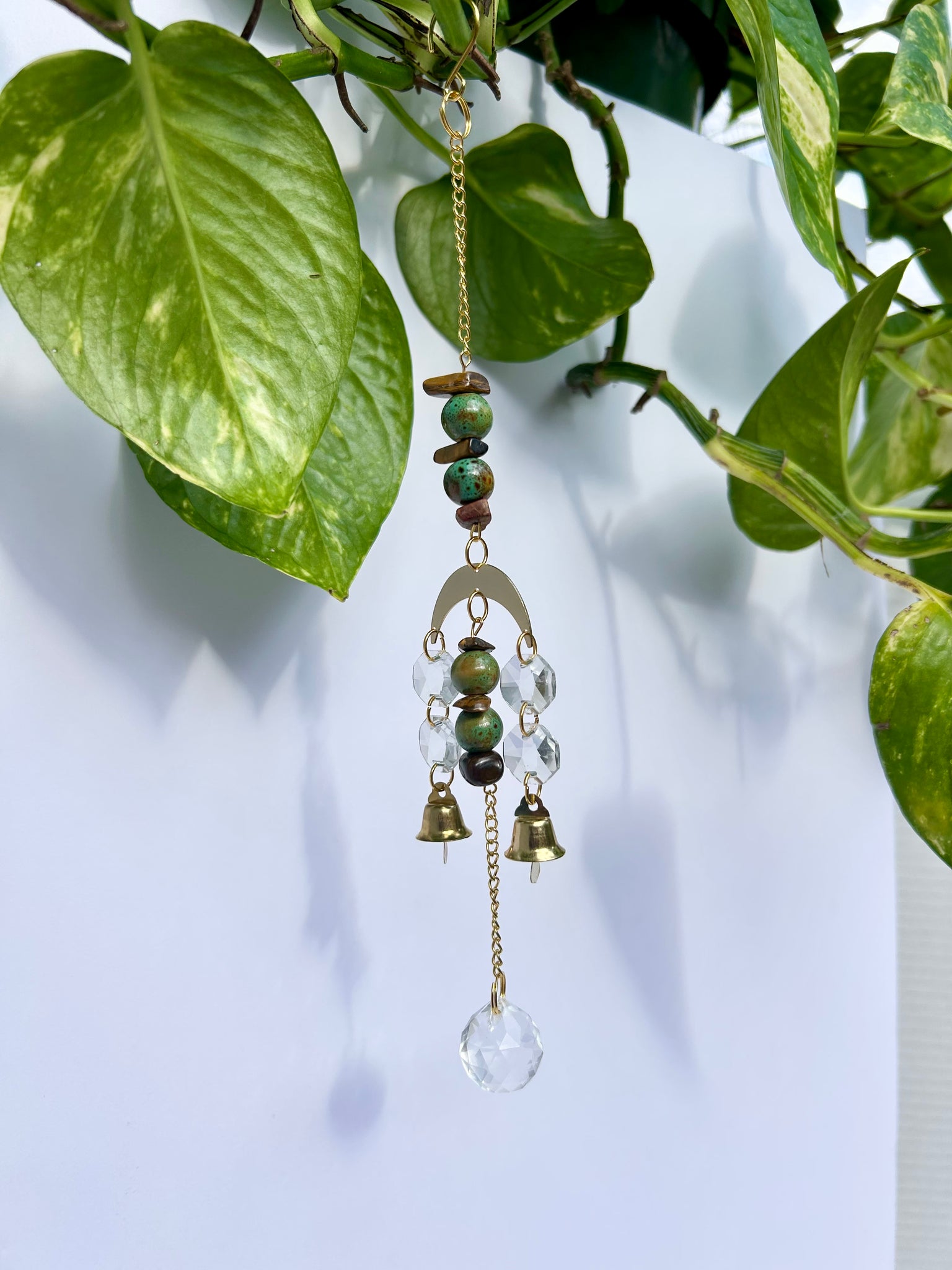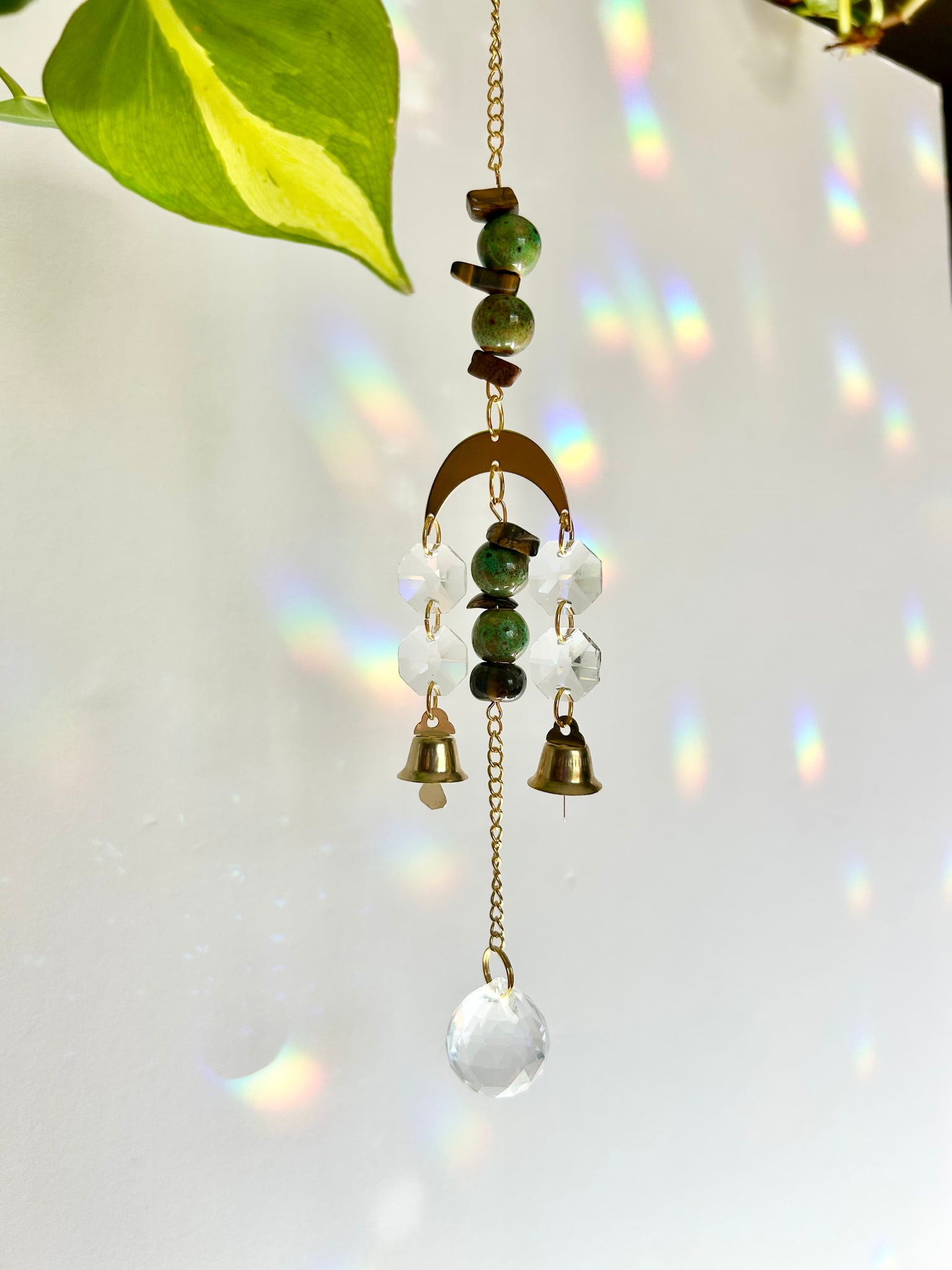 Bring a touch of magic to any space with this mini gold moon suncatcher. Handcrafted with Turquoise clay beads and Tiger’s Eye, this charming ornament hangs on a gold chain with delicate bells, adding subtle movement and sound. Perfect for boho, witchy, or crystal-inspired decor, it’s ideal for sunny windows, small spaces, or even as a thoughtful gift. Watch as sunlight catches the cut crystal and beads, scattering tiny rainbow prisms throughout your room.