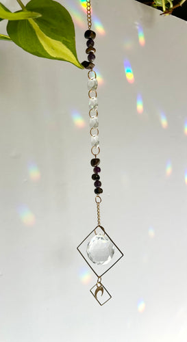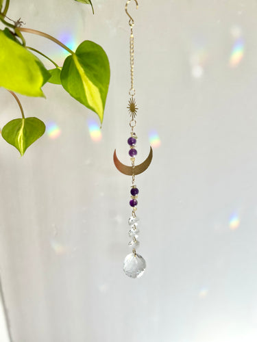 Gold Moon Suncatcher with Amethyst & Citrine Beads and Sun Charm – Rainbow Light Window Decor