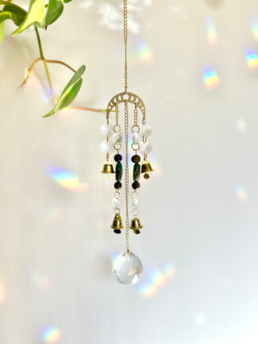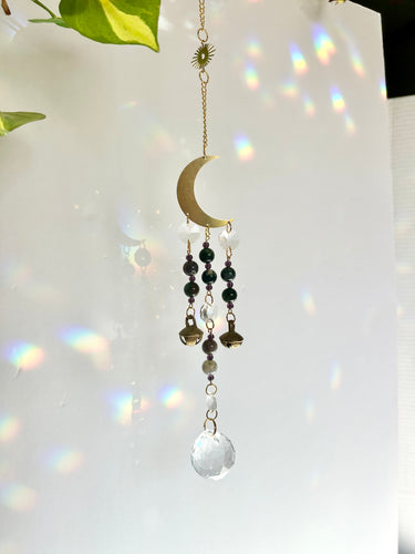 Mini Gold Moon Suncatcher with Green & Blue Glass Beads and Bells – Rainbow Prism Window Decor