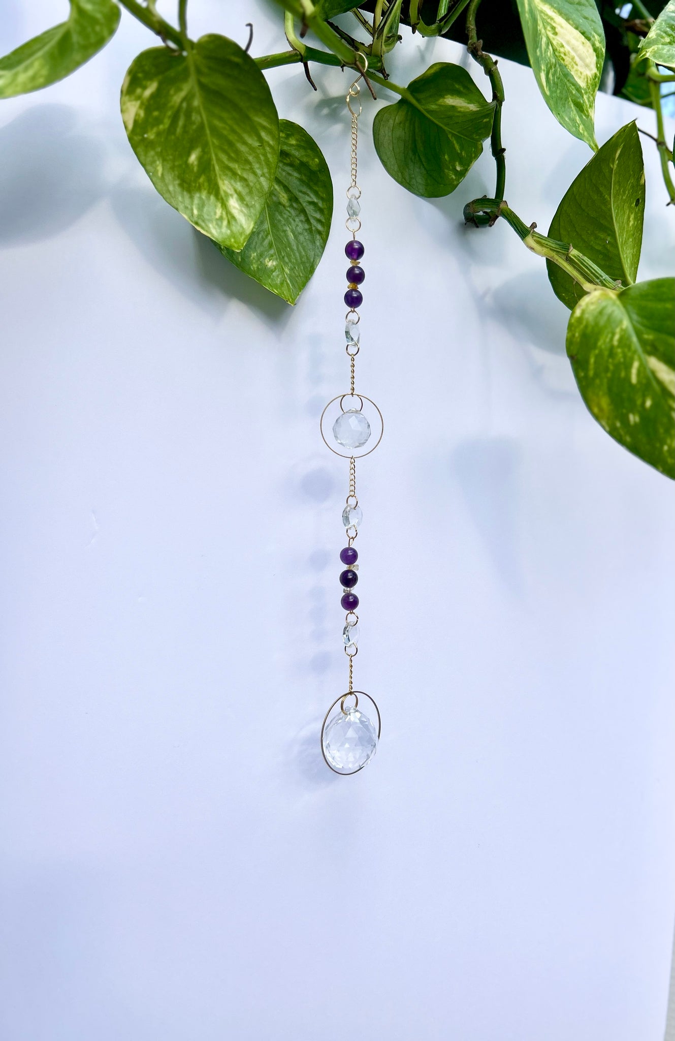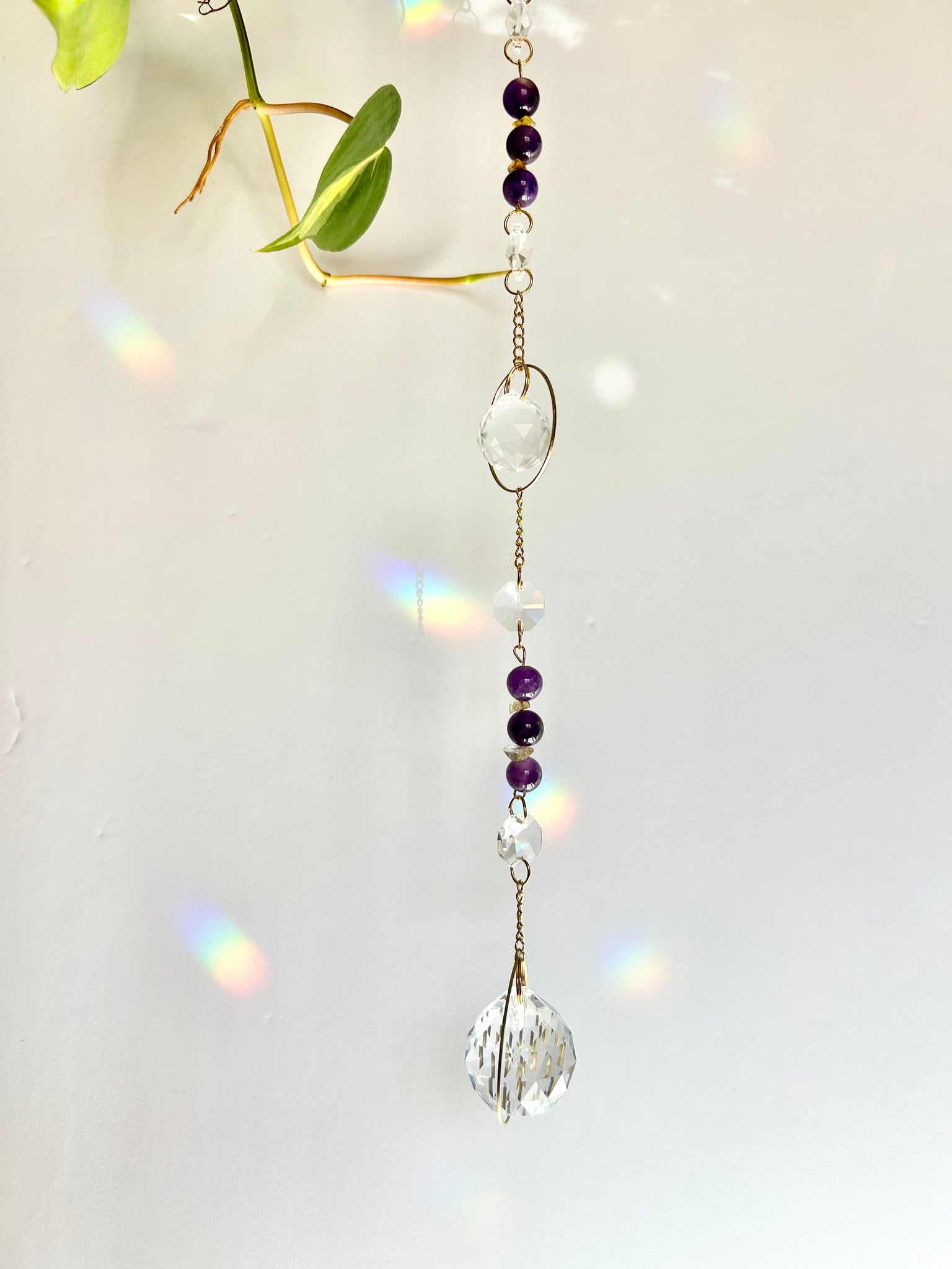 This elegant Amethyst & Citrine Suncatcher is crafted with two brilliantly cut prisms — one small and one large — framed by gold metal circles that highlight their sparkle. Designed for maximum light play, the dual prisms create layered rainbow refractions that dance across your space whenever the sunlight hits.