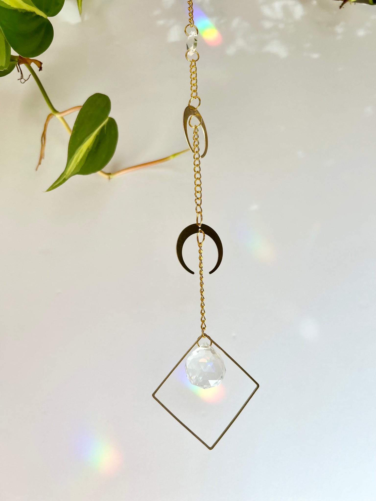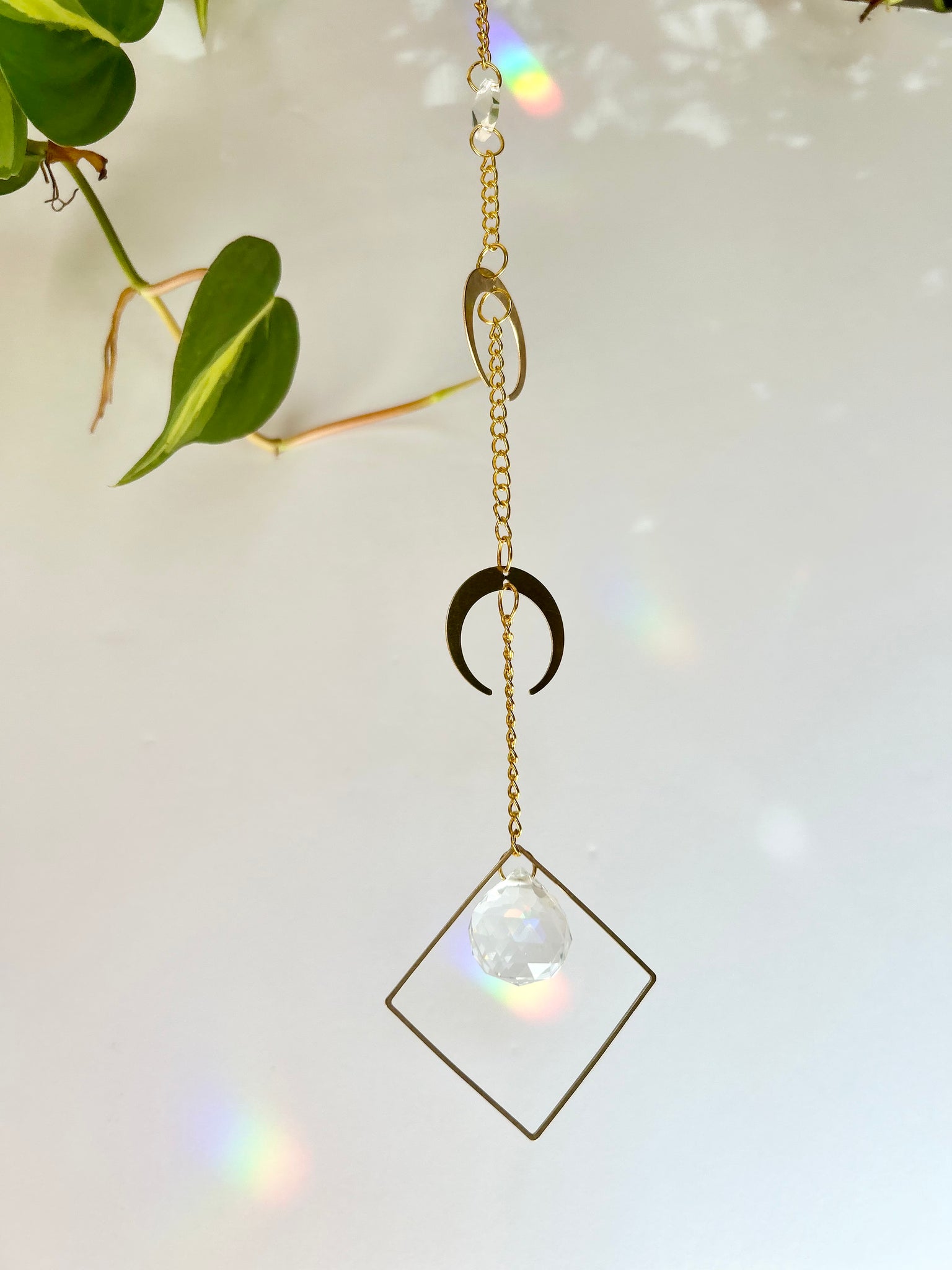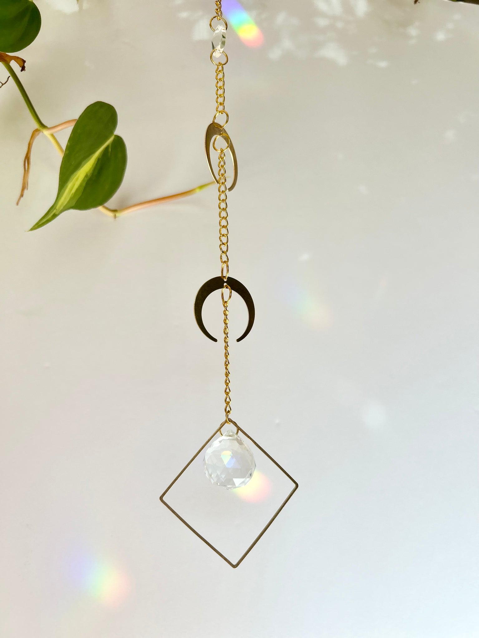 Celebrate celestial energy with this double gold half moon suncatcher. Two layered half moons accompany a small prism framed in a gold diamond shape, catching sunlight to cast shimmering rainbows across your walls, ceiling, or floors. This piece evokes a mystical, witchy woman vibe, perfect for adding subtle magic to your space.