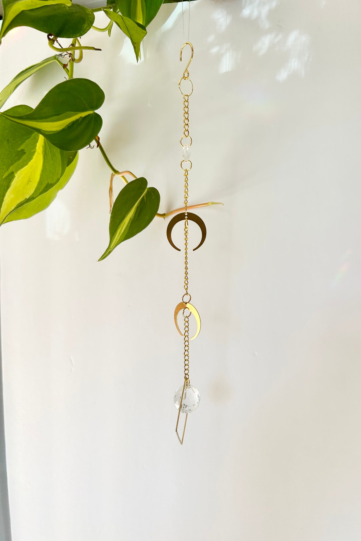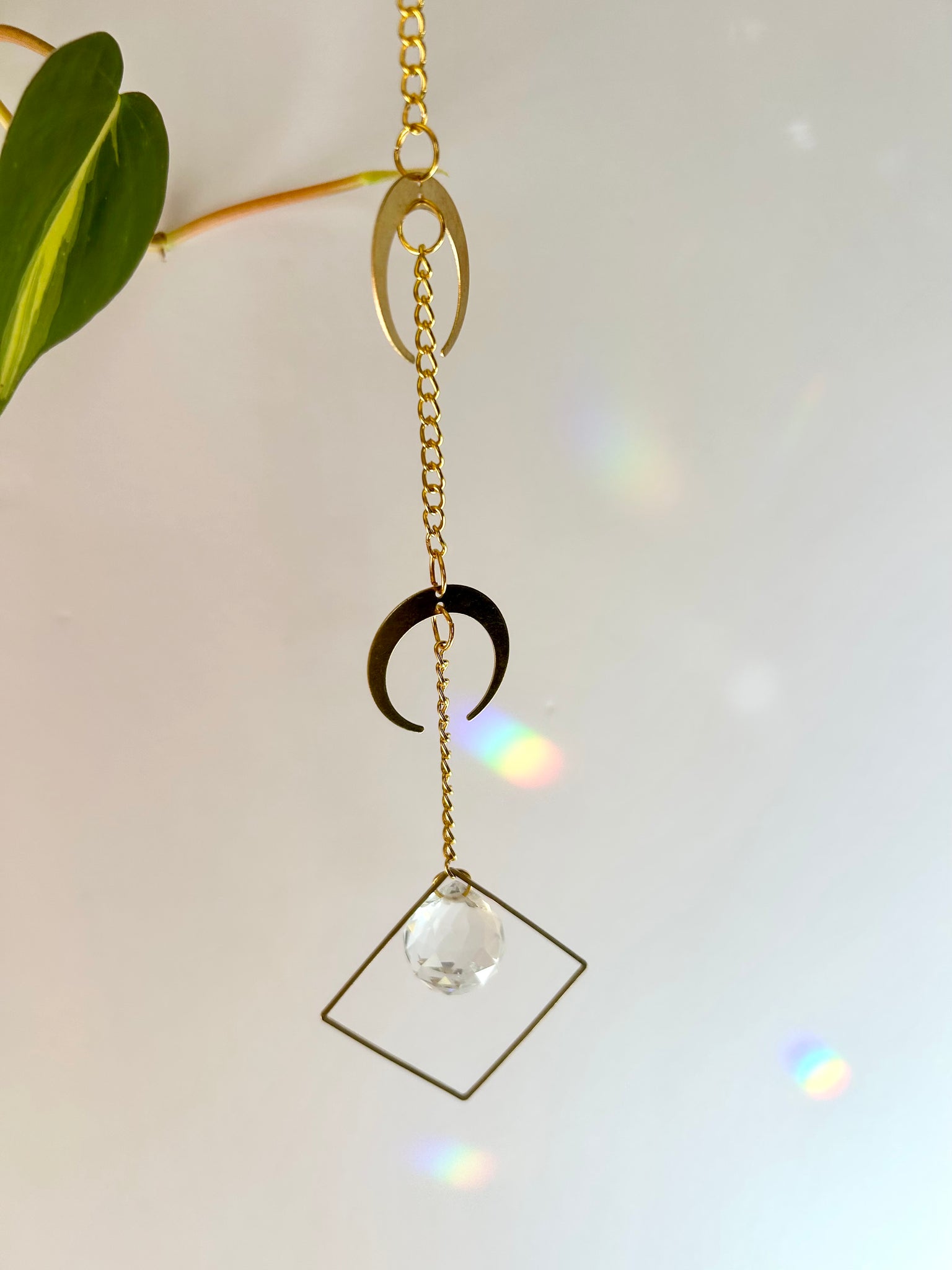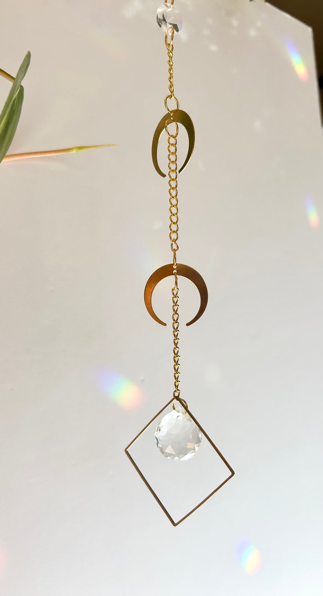 Celebrate celestial energy with this double gold half moon suncatcher. Two layered half moons accompany a small prism framed in a gold diamond shape, catching sunlight to cast shimmering rainbows across your walls, ceiling, or floors. This piece evokes a mystical, witchy woman vibe, perfect for adding subtle magic to your space.