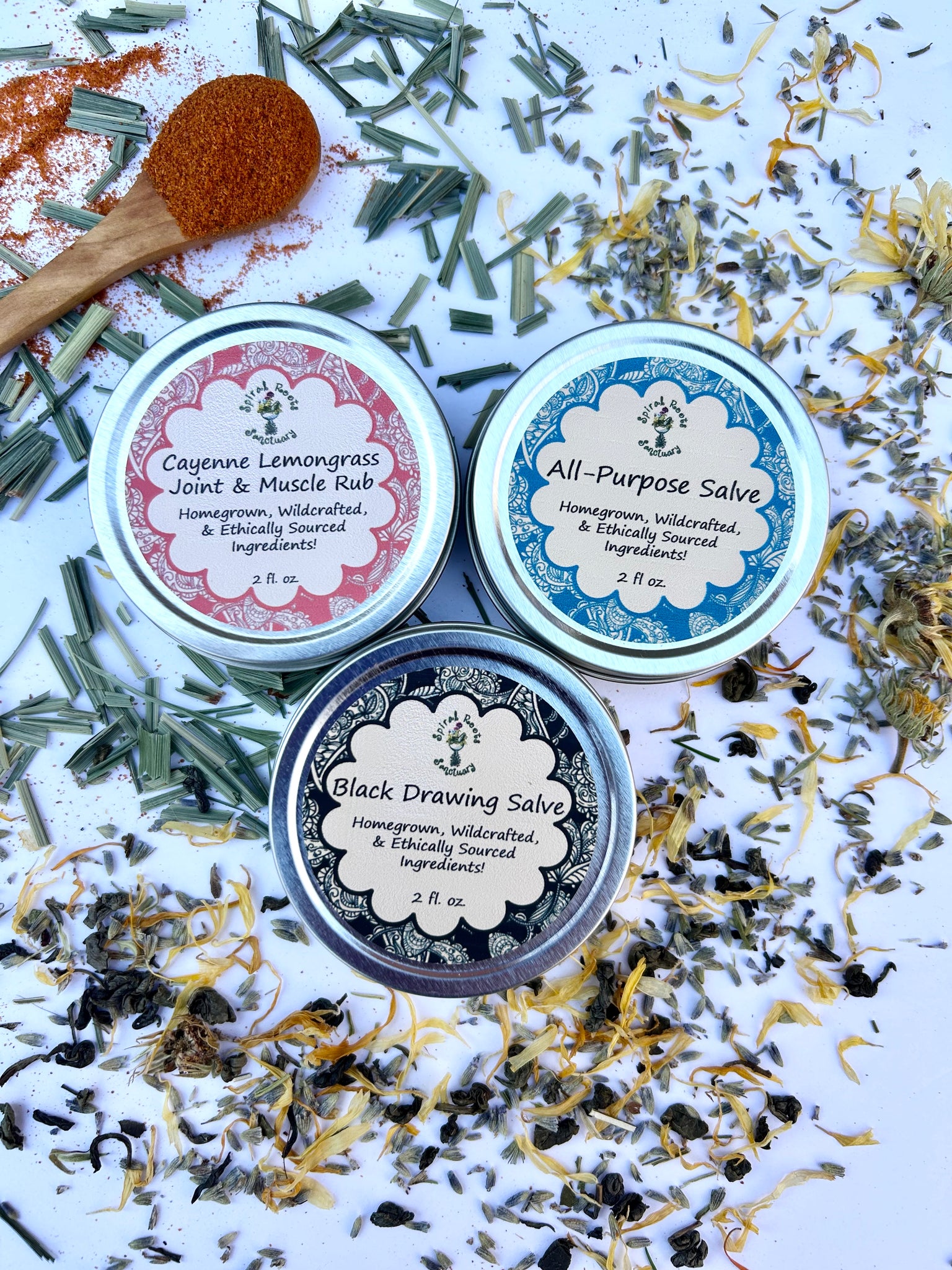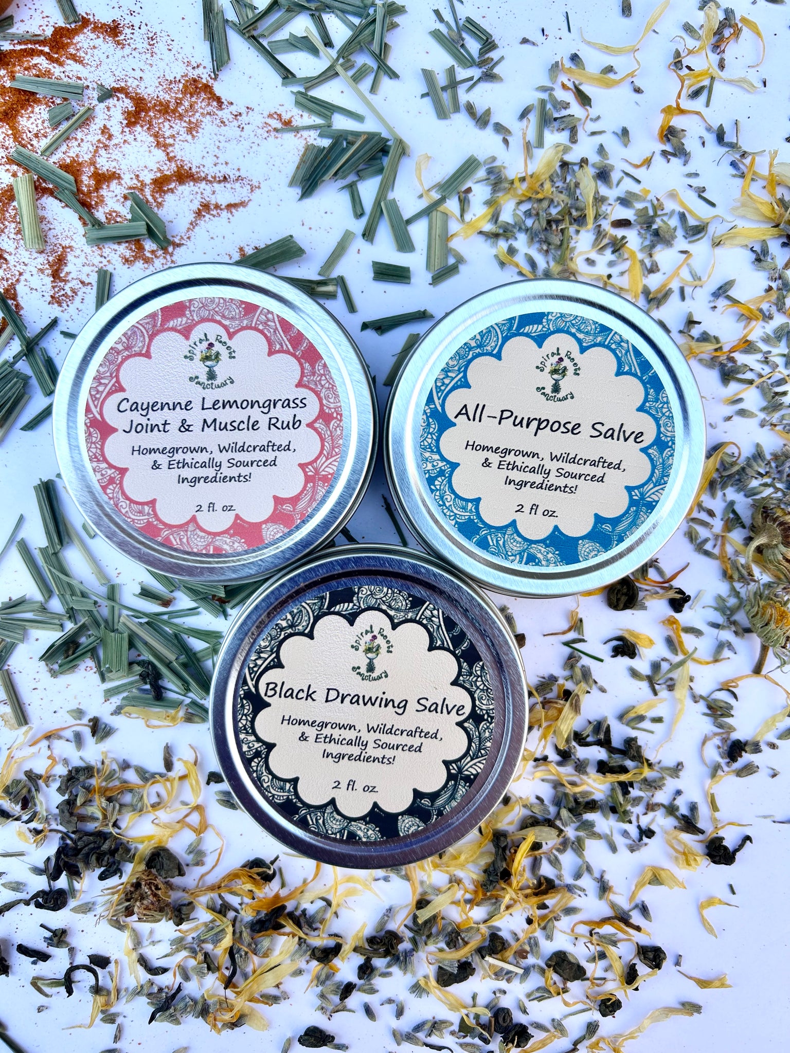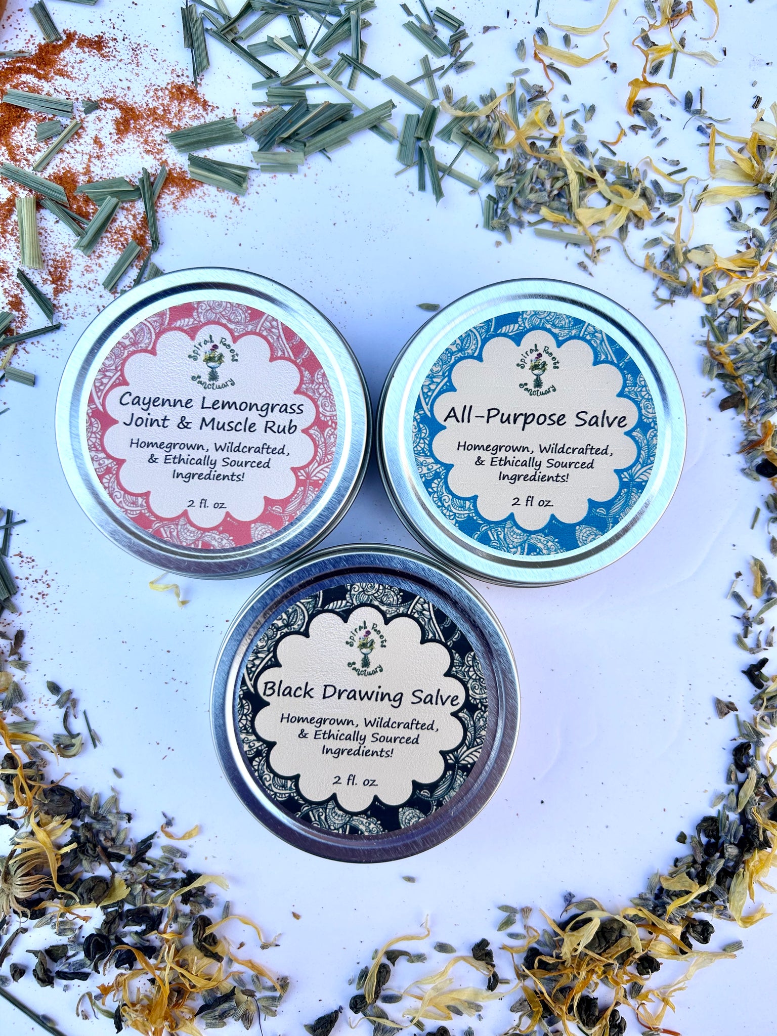 Each salve comes in a 2 oz. screw-top tin, perfect for portability and easy application. Made with organic, wildcrafted, and homegrown herbs, this salve set is a natural remedy for cuts, burns, sore muscles, stings, and more.