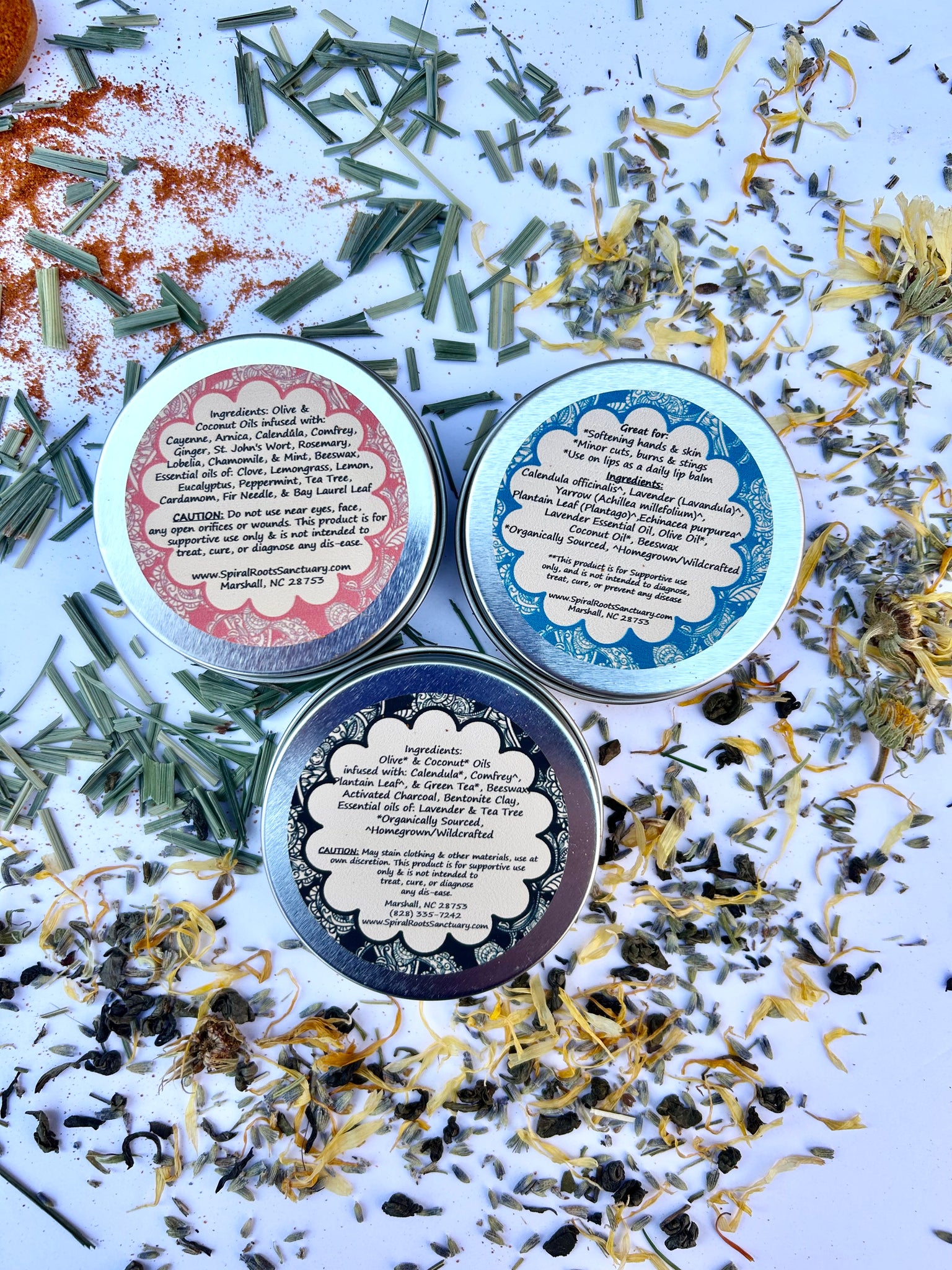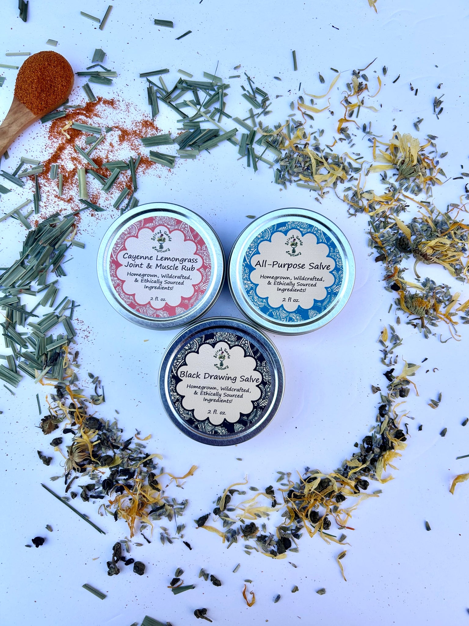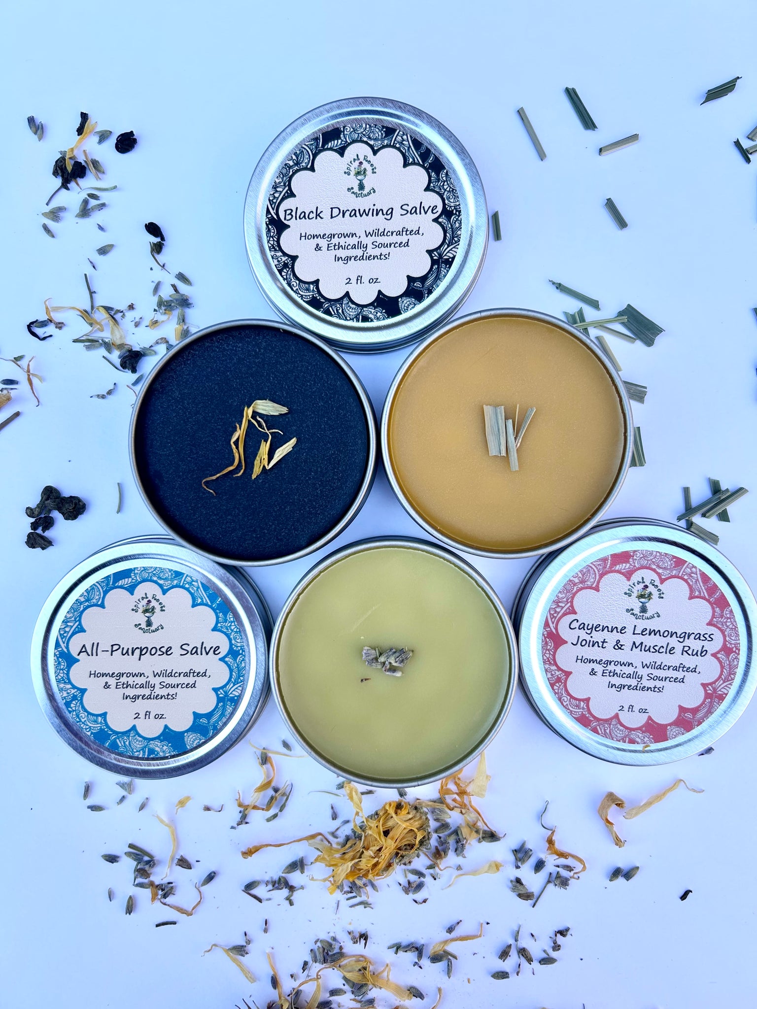 Each salve comes in a 2 oz. screw-top tin, perfect for portability and easy application. Made with organic, wildcrafted, and homegrown herbs, this salve set is a natural remedy for cuts, burns, sore muscles, stings, and more.